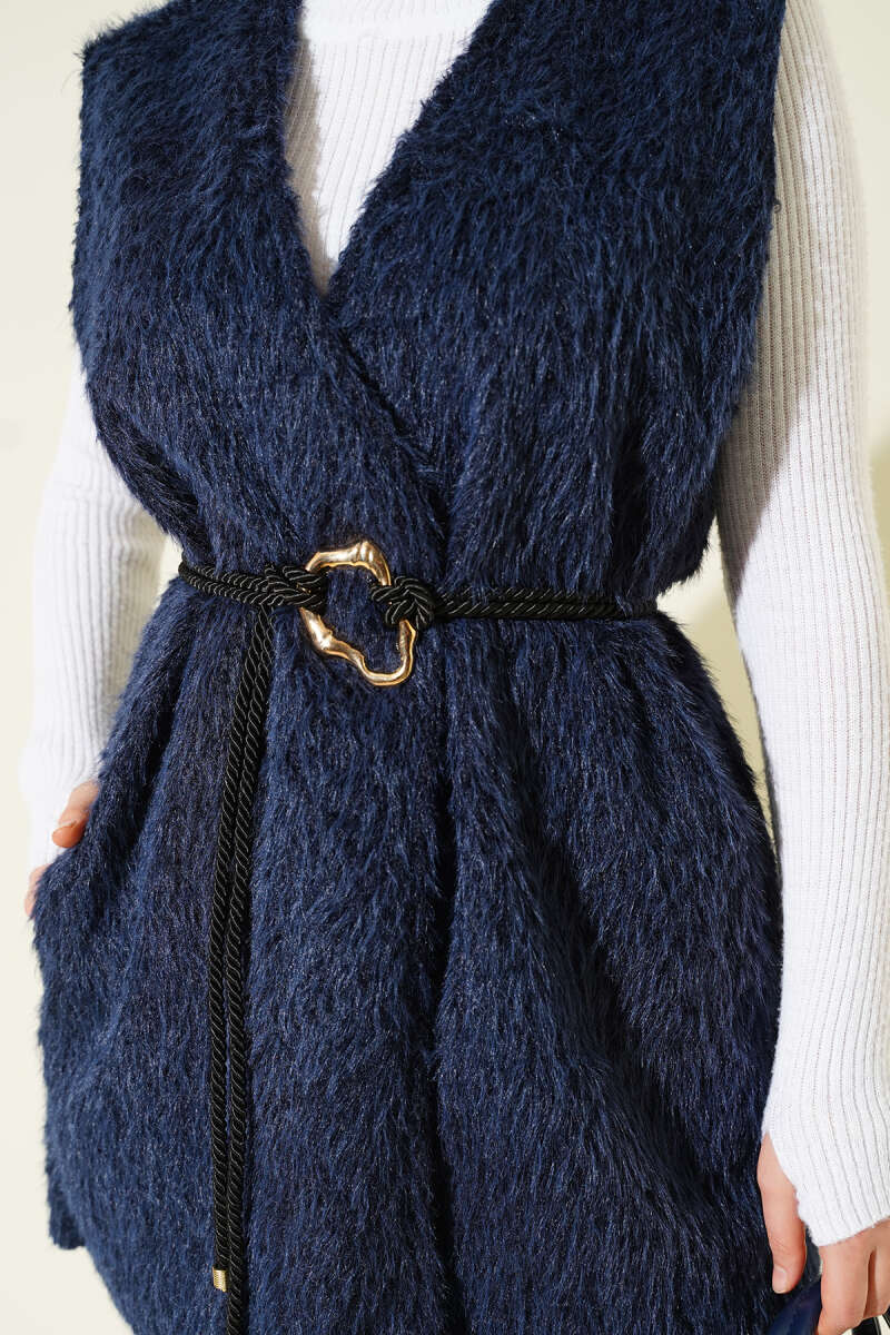 Tek Düğmeli Kemerli Sakallı Yelek Lacivert