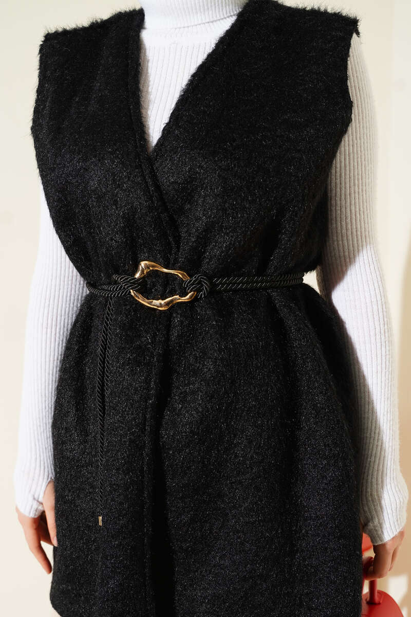 Gold Aksesuarlı Kuşaklı Sakallı Yelek Füme