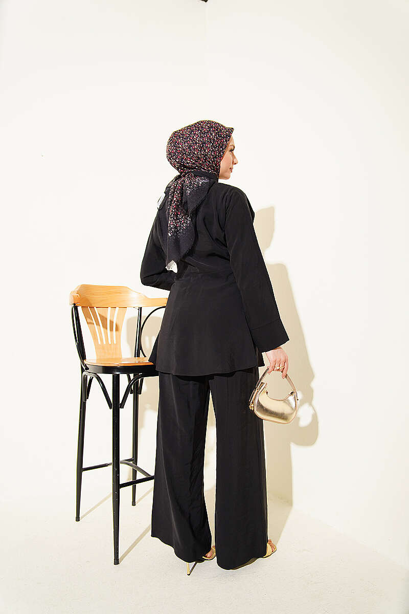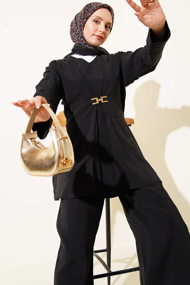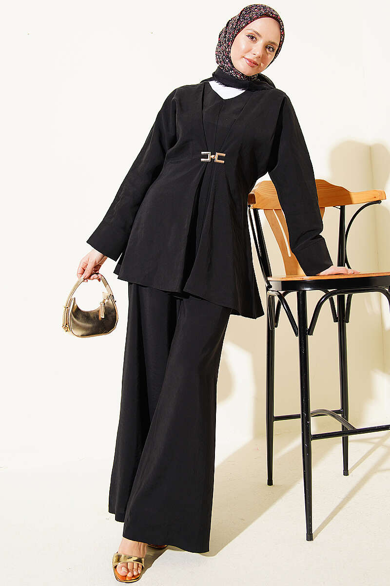 Gold Aksesuarlı V Yaka Modal İkili Takım Siyah