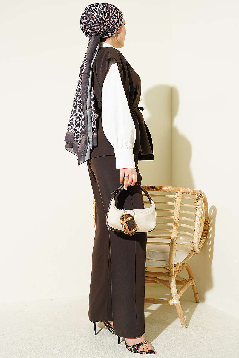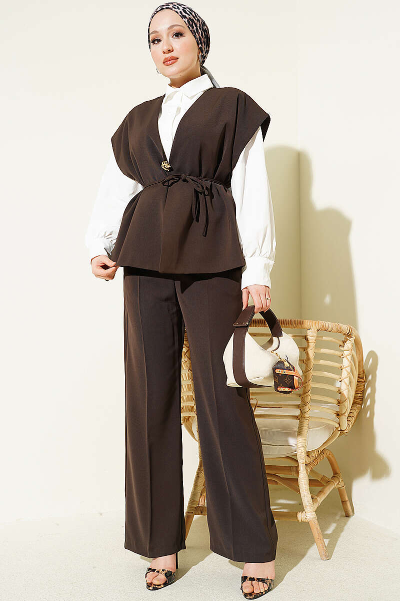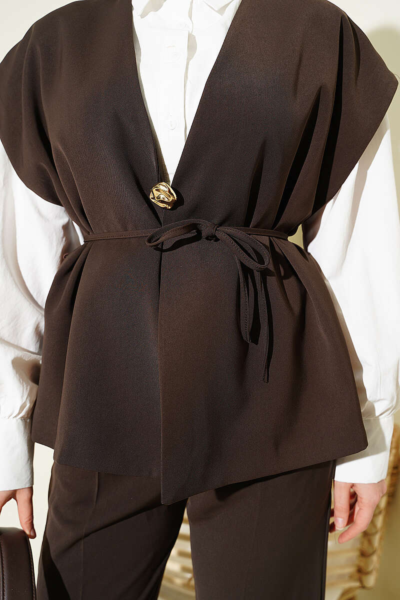 Maskülen kesimli yelek detayıyla katmanlı ve sofistike bir duruş sergiler. Yeleğin ön kısmında yer alan zarif gold broş aksesuarı, takıma ışıltılı bir odak noktası kazandırarak sade tasarımı şık bir boyuta taşır. Ütü izi detaylı düz kesim pantolonu ve dökümlü kumaş yapısı sayesinde hem profesyonel bir ofis stili hem de özel gün kombinleri için ideal, konforlu bir silüet sunar.