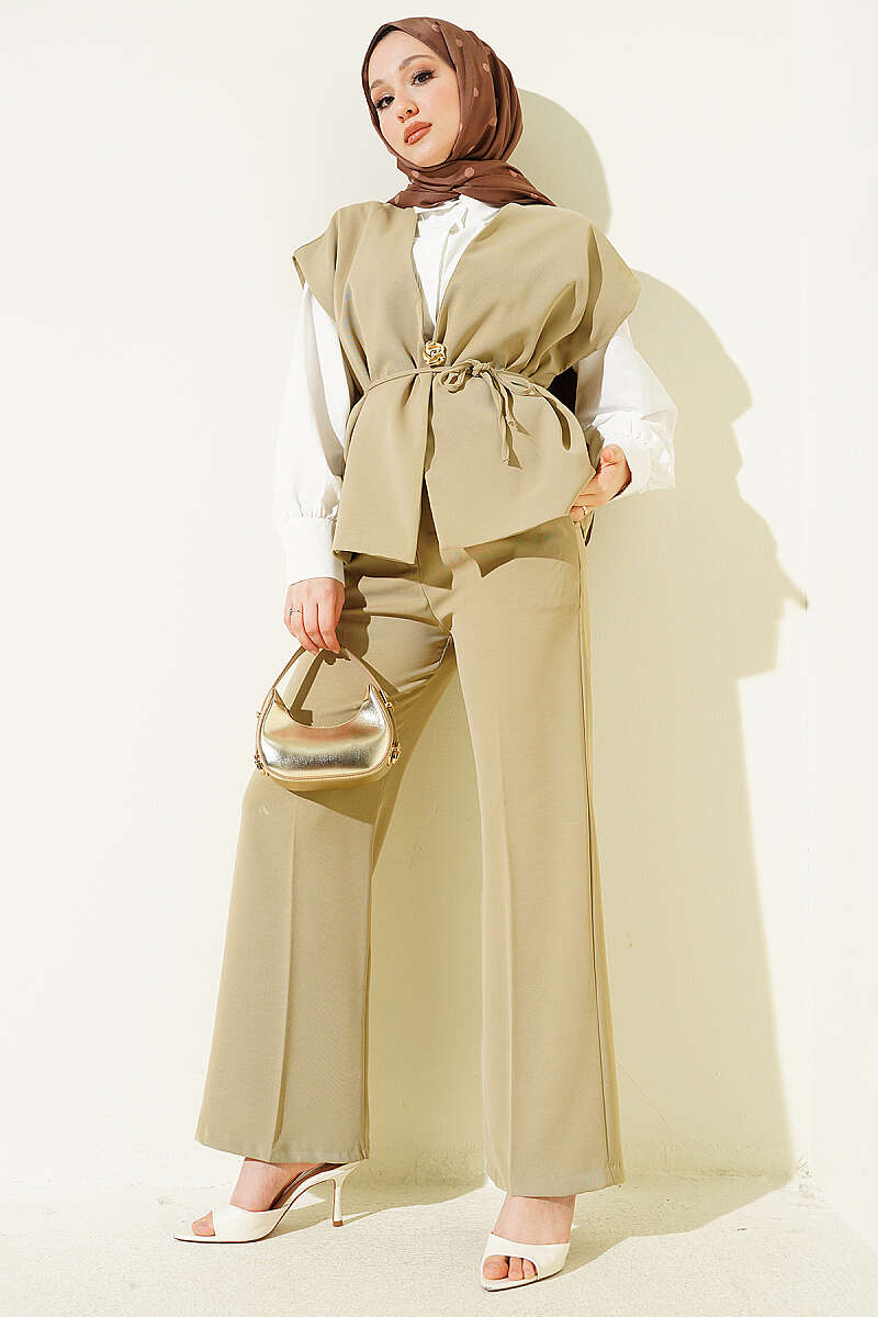 Gold Broşlu Yelekli İkili Takım Bej
