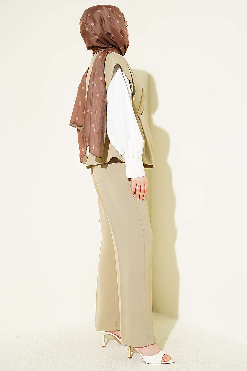 Maskülen kesimli yelek detayıyla katmanlı ve sofistike bir duruş sergiler. Yeleğin ön kısmında yer alan zarif gold broş aksesuarı, takıma ışıltılı bir odak noktası kazandırarak sade tasarımı şık bir boyuta taşır. Ütü izi detaylı düz kesim pantolonu ve dökümlü kumaş yapısı sayesinde hem profesyonel bir ofis stili hem de özel gün kombinleri için ideal, konforlu bir silüet sunar.