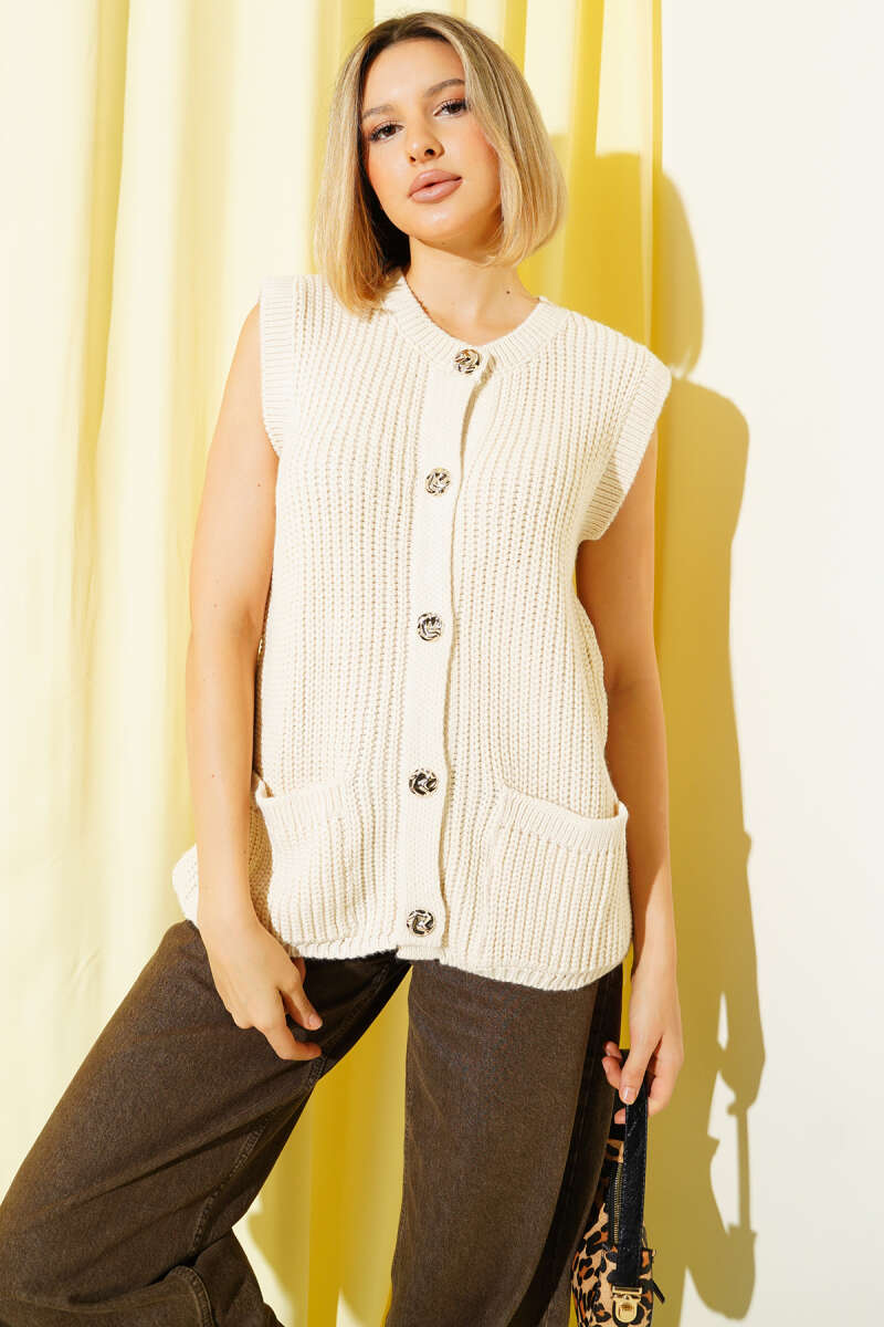 Çiçekli Baklava Desenli Triko Hırka Ekru