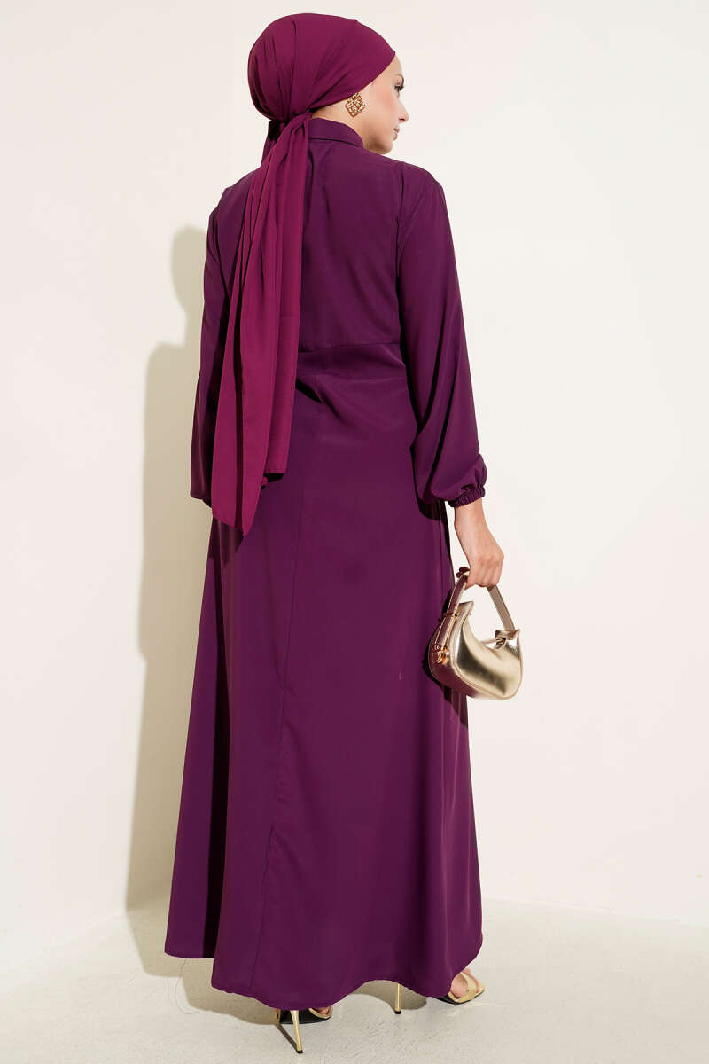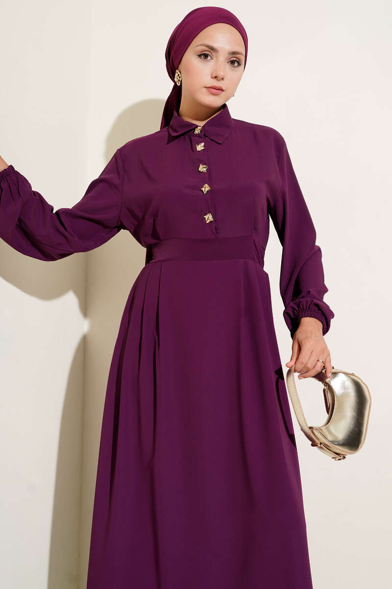 Gold Düğme Detaylı Elbise Mor