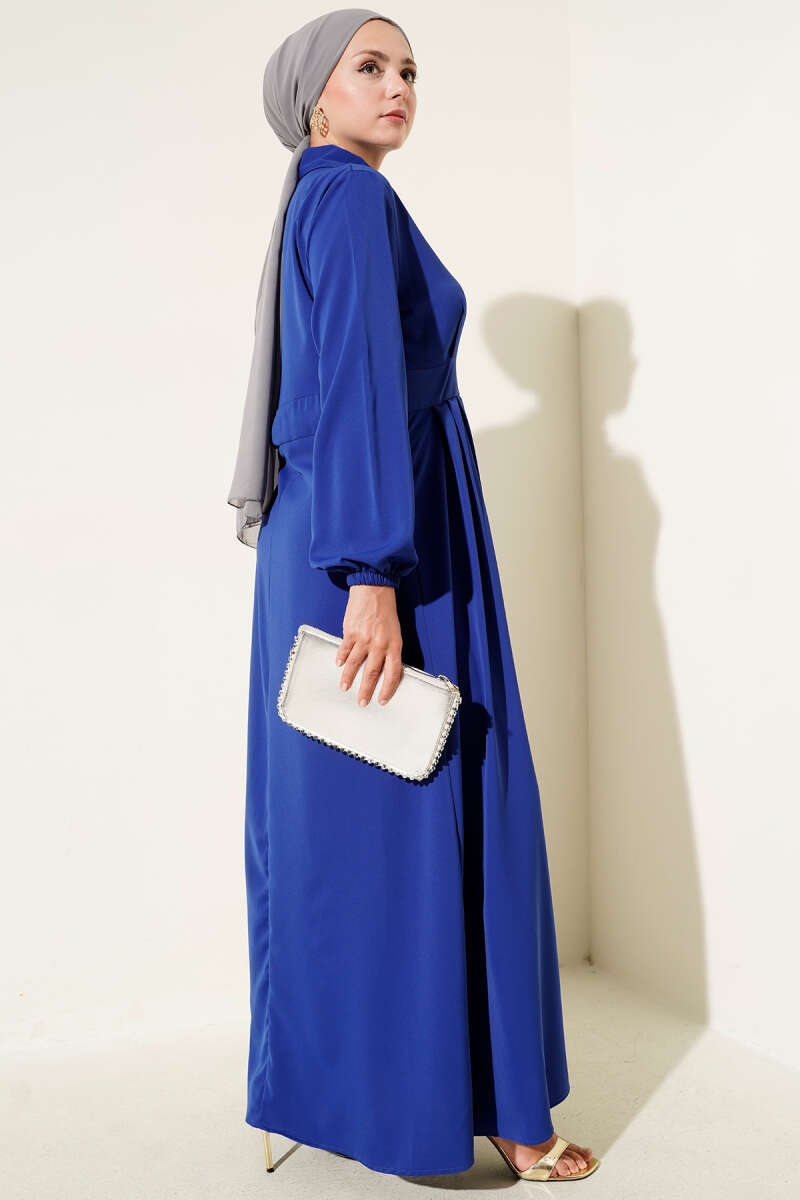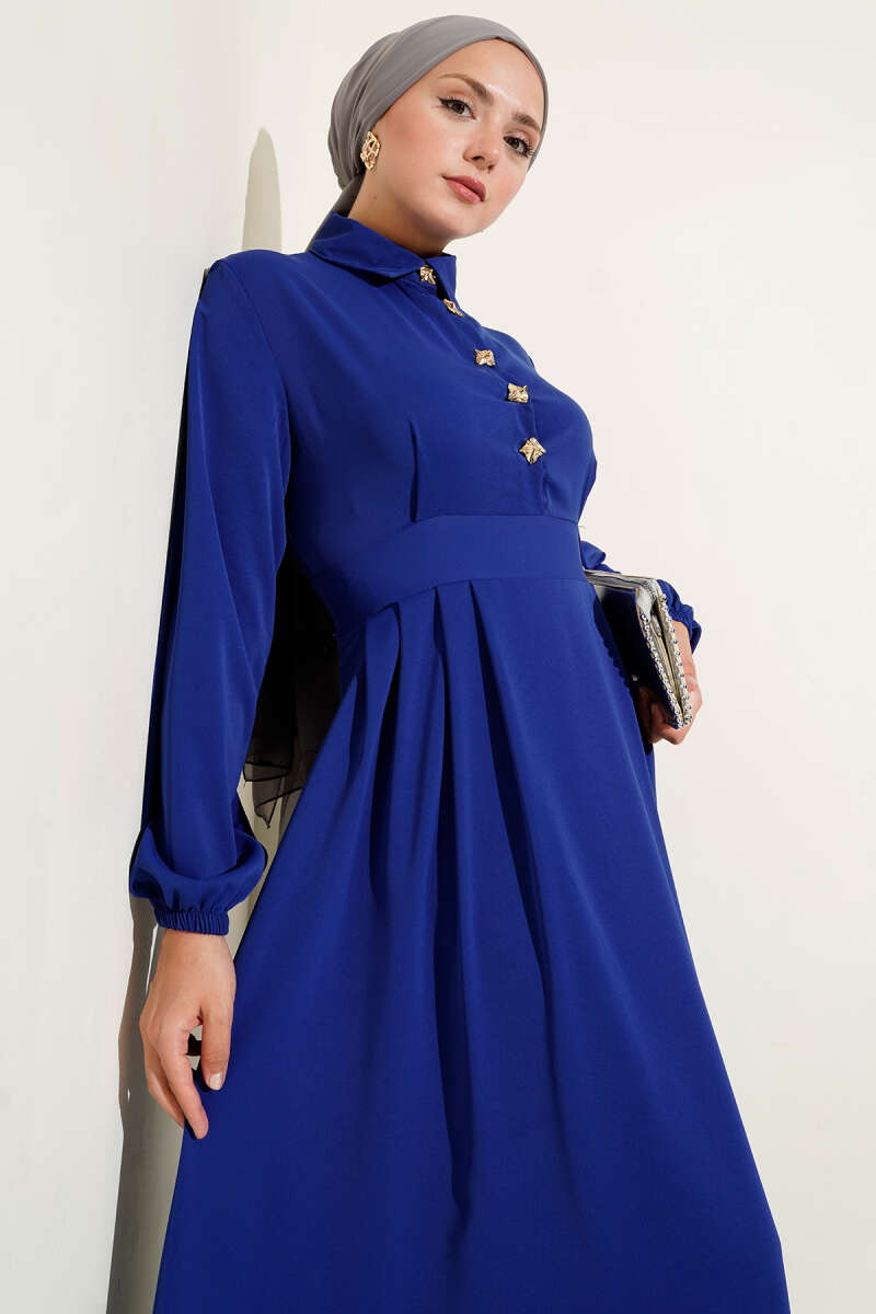 Bel Taşlı Pelerinli Abiye Elbise Lacivert