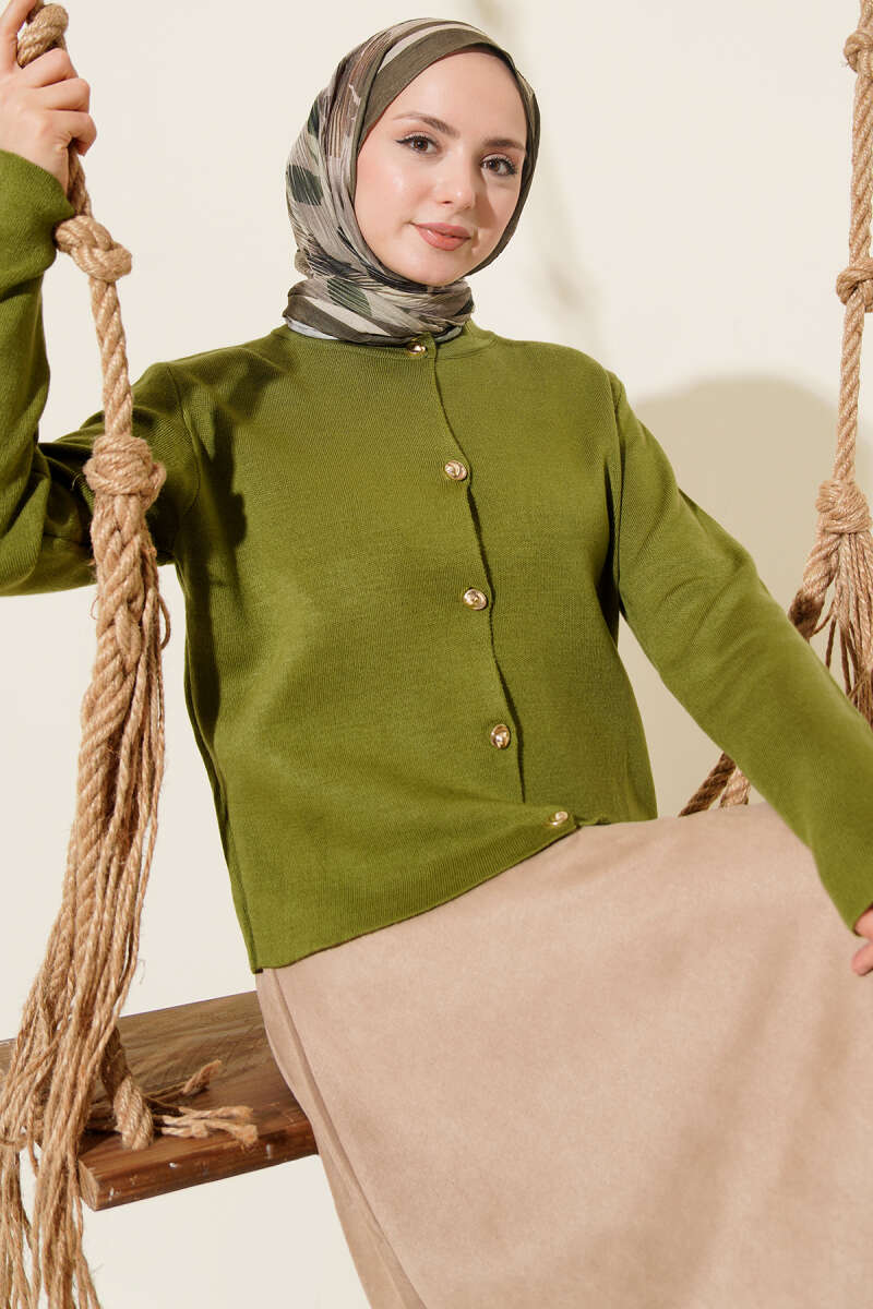 Gold Düğme Detaylı Kısa Triko Hırka Yağ Yeşili