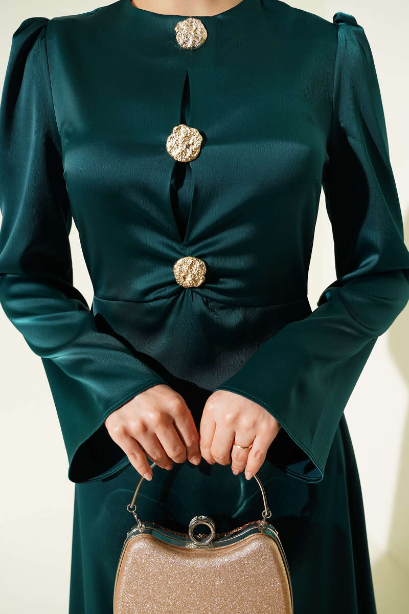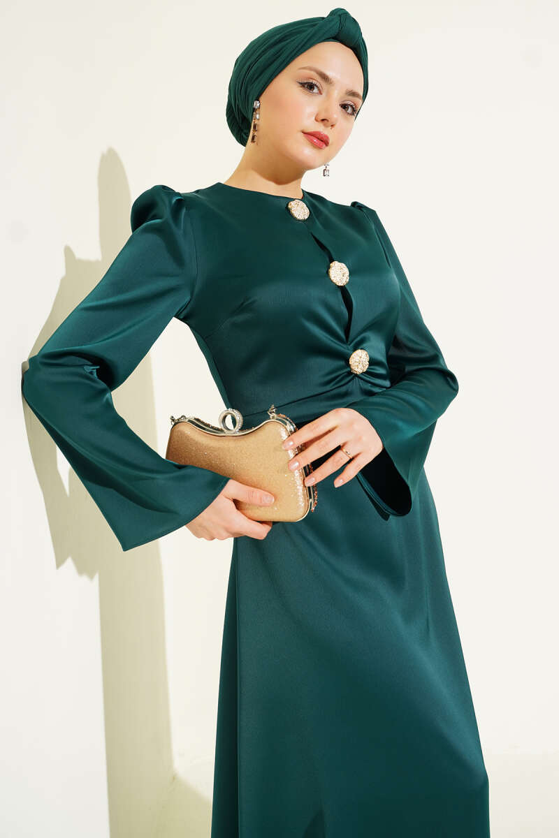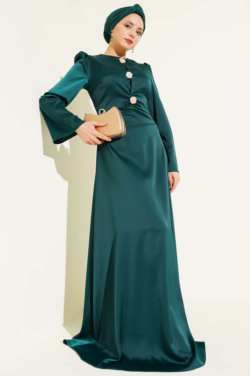 Büzgü Detaylı Simli Abiye Elbise Haki