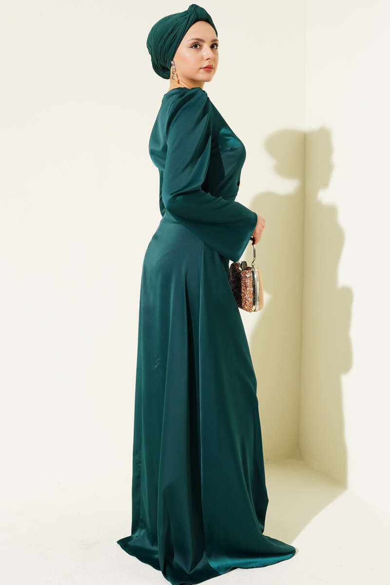 Bel Taşlı Pelerinli Abiye Elbise Haki