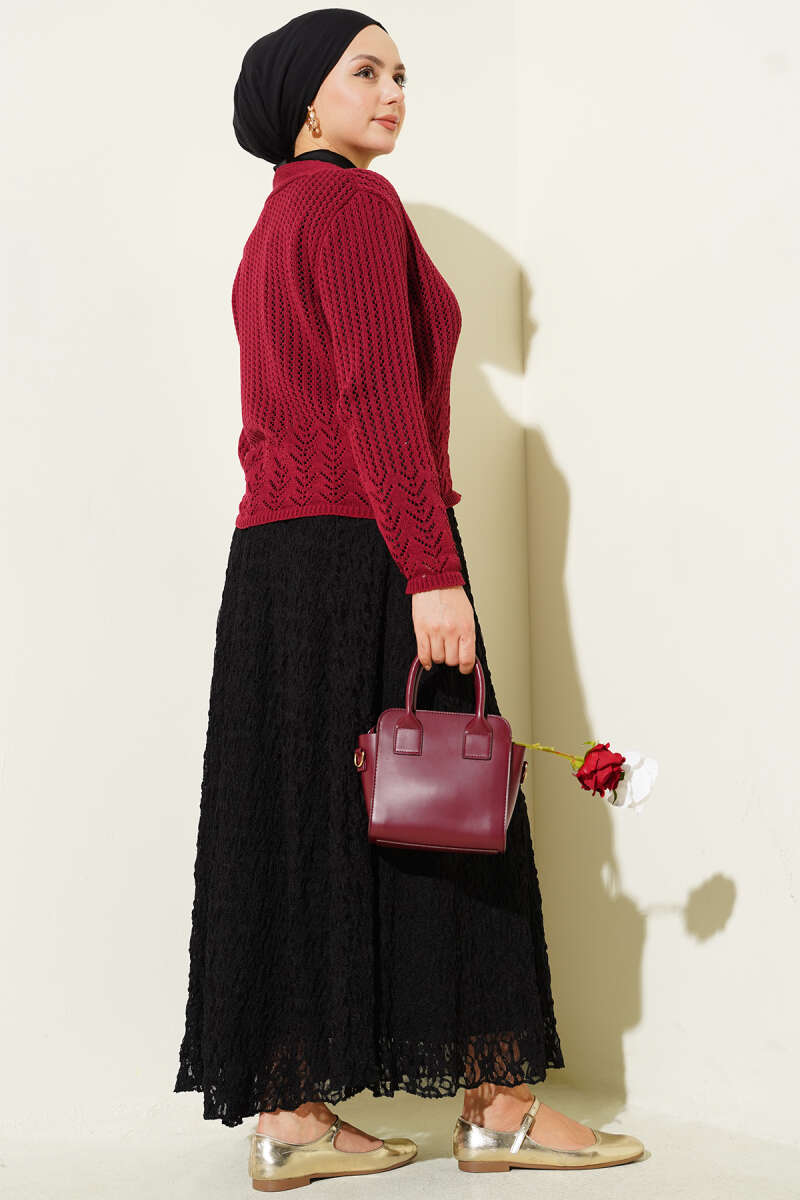 Gold Düğmeli Ajurlu Kısa Triko Hırka Bordo