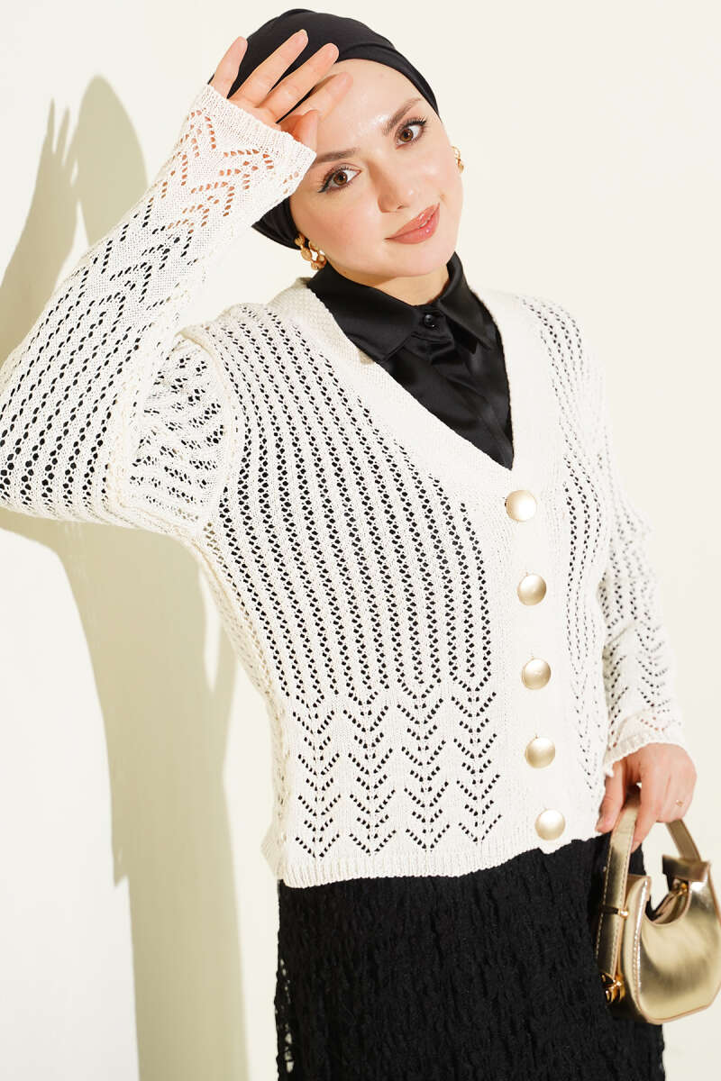 Gold Düğmeli Ajurlu Kısa Triko Hırka Ekru