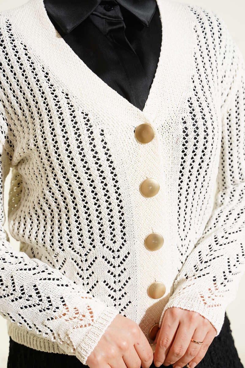 Gold Düğmeli Ajurlu Kısa Triko Hırka Ekru