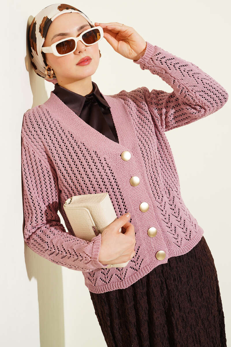 Gold Düğmeli Ajurlu Kısa Triko Hırka Pembe
