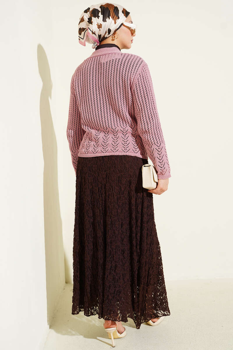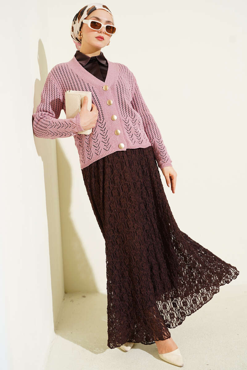 Gold Düğmeli Ajurlu Kısa Triko Hırka Kahve