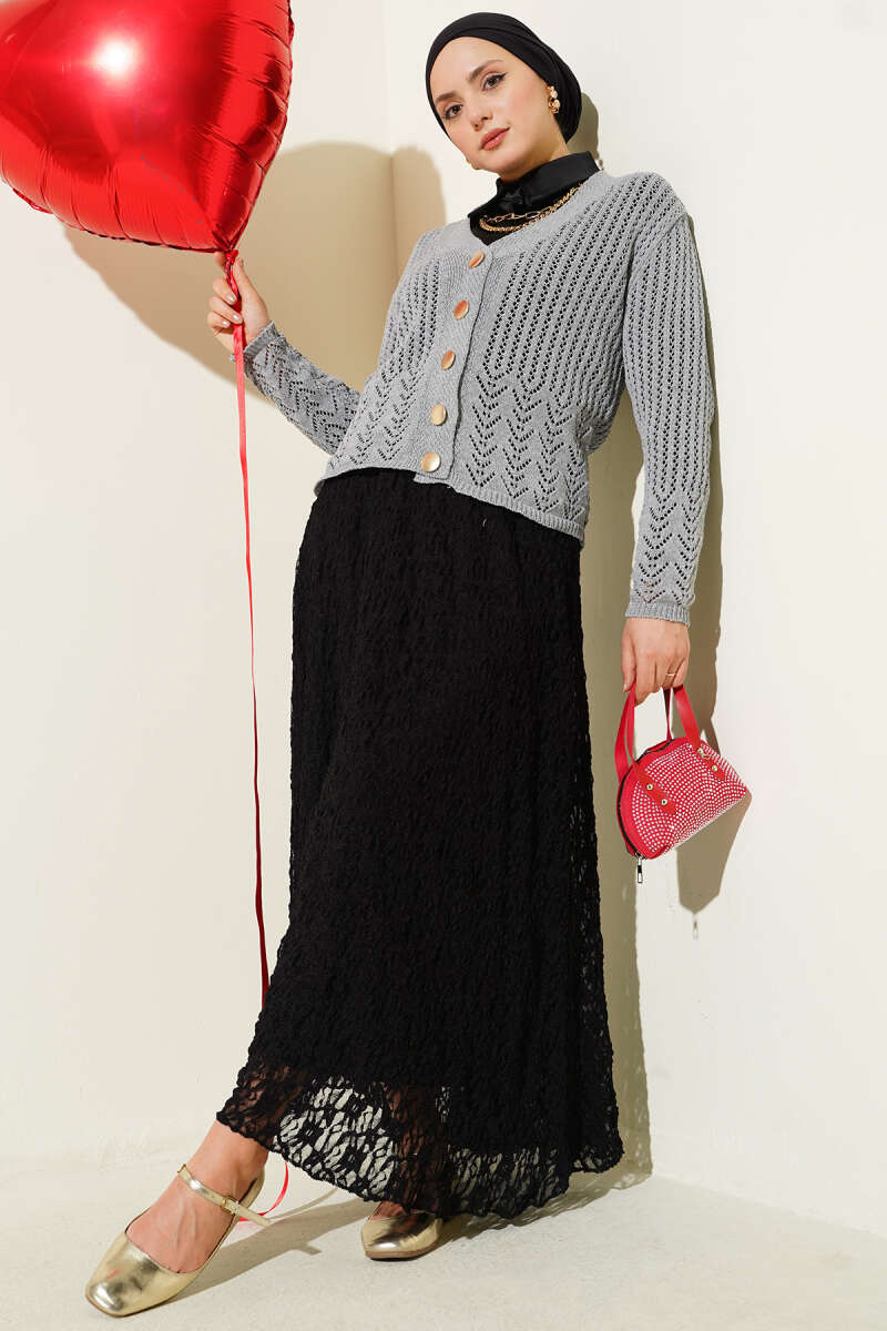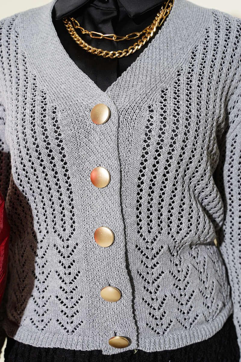 Gold Düğmeli Ajurlu Kısa Triko Hırka Gri
