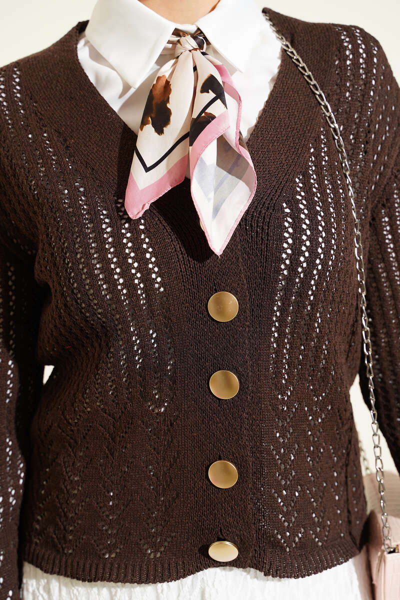 Gold Düğmeli Ajurlu Kısa Triko Hırka Kahve