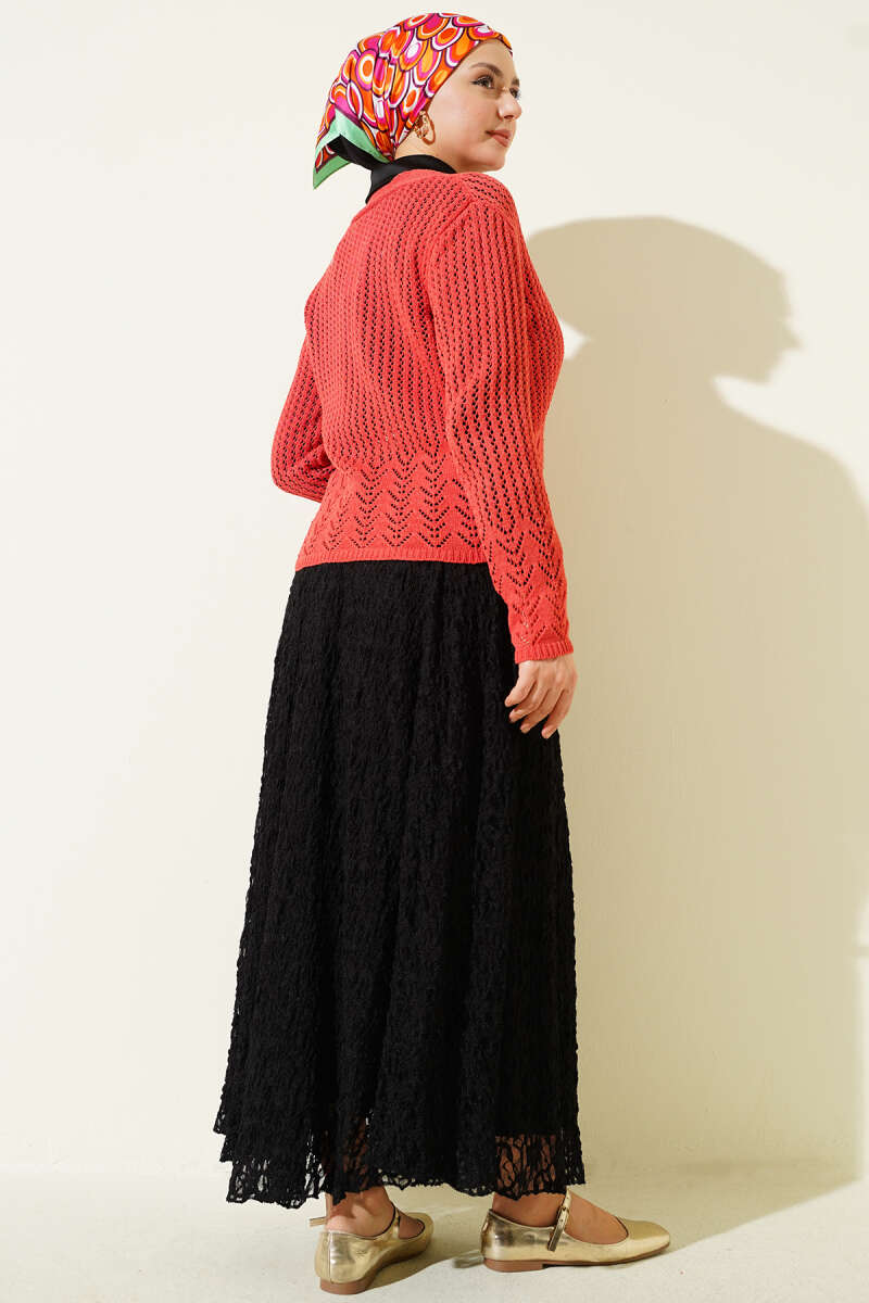 Gold Düğmeli Ajurlu Kısa Triko Hırka Mercan