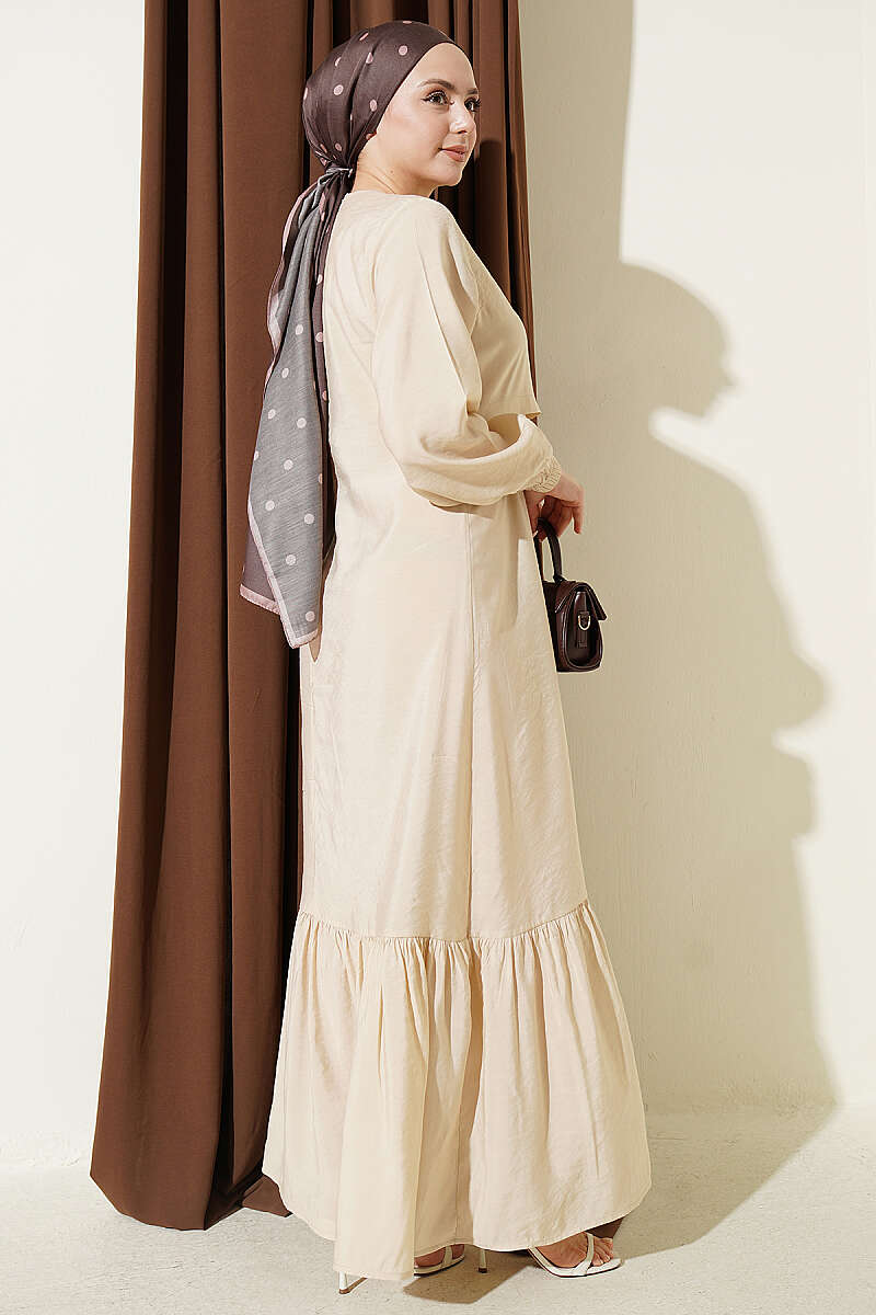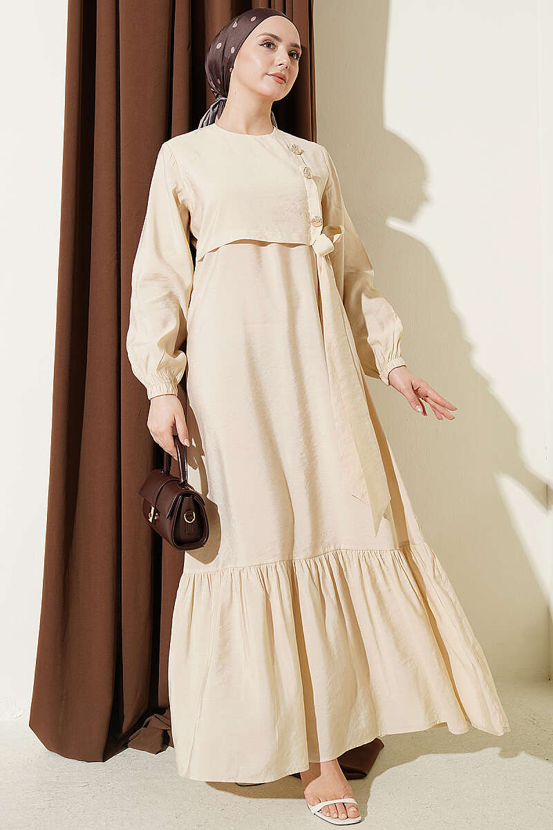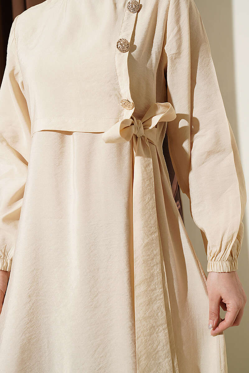 Gold Düğmeli Bağlamalı Modal Elbise Bej