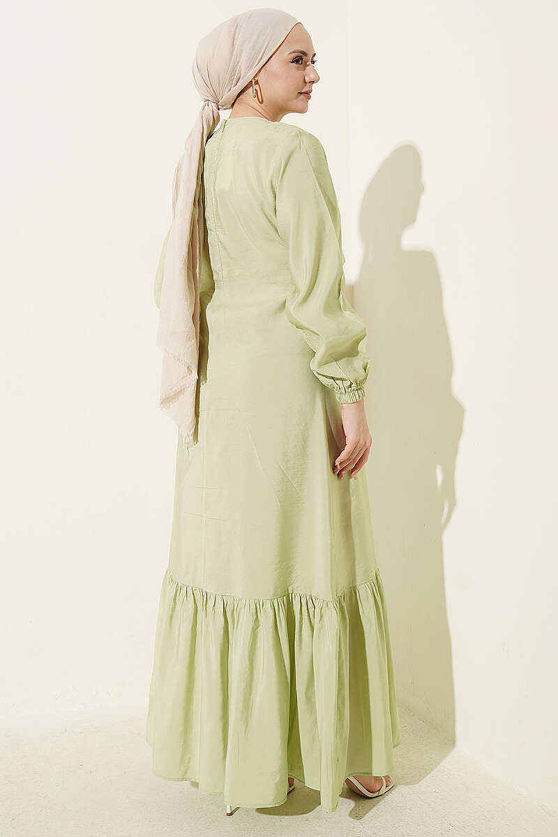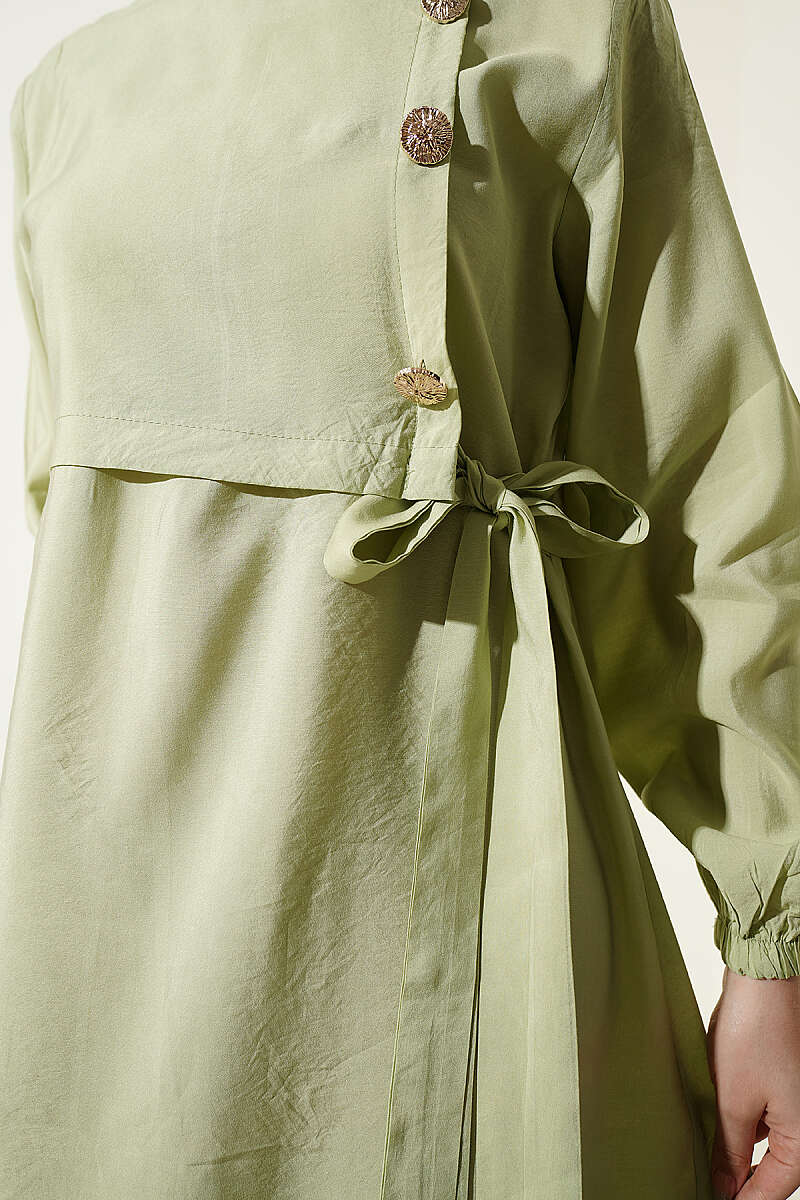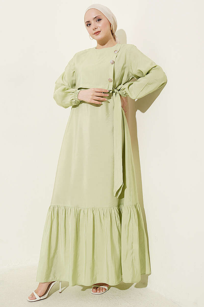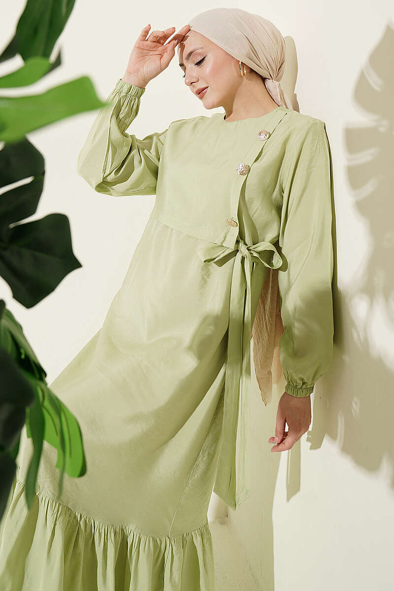 Gold Düğmeli Bağlamalı Modal Elbise Çağla Yeşili