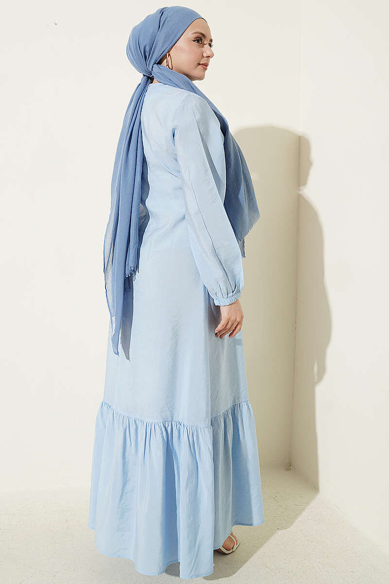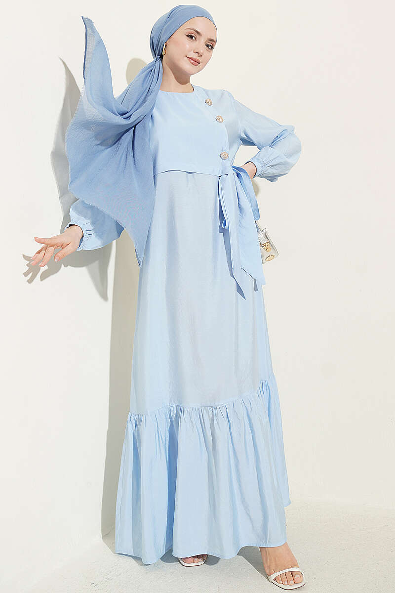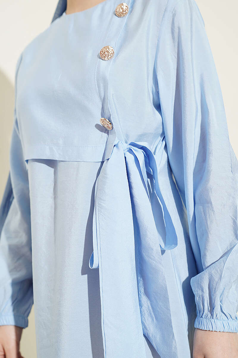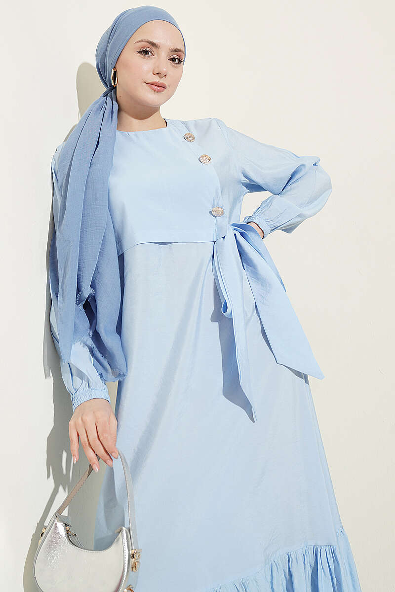 Gold Düğmeli Bağlamalı Modal Elbise Mavi