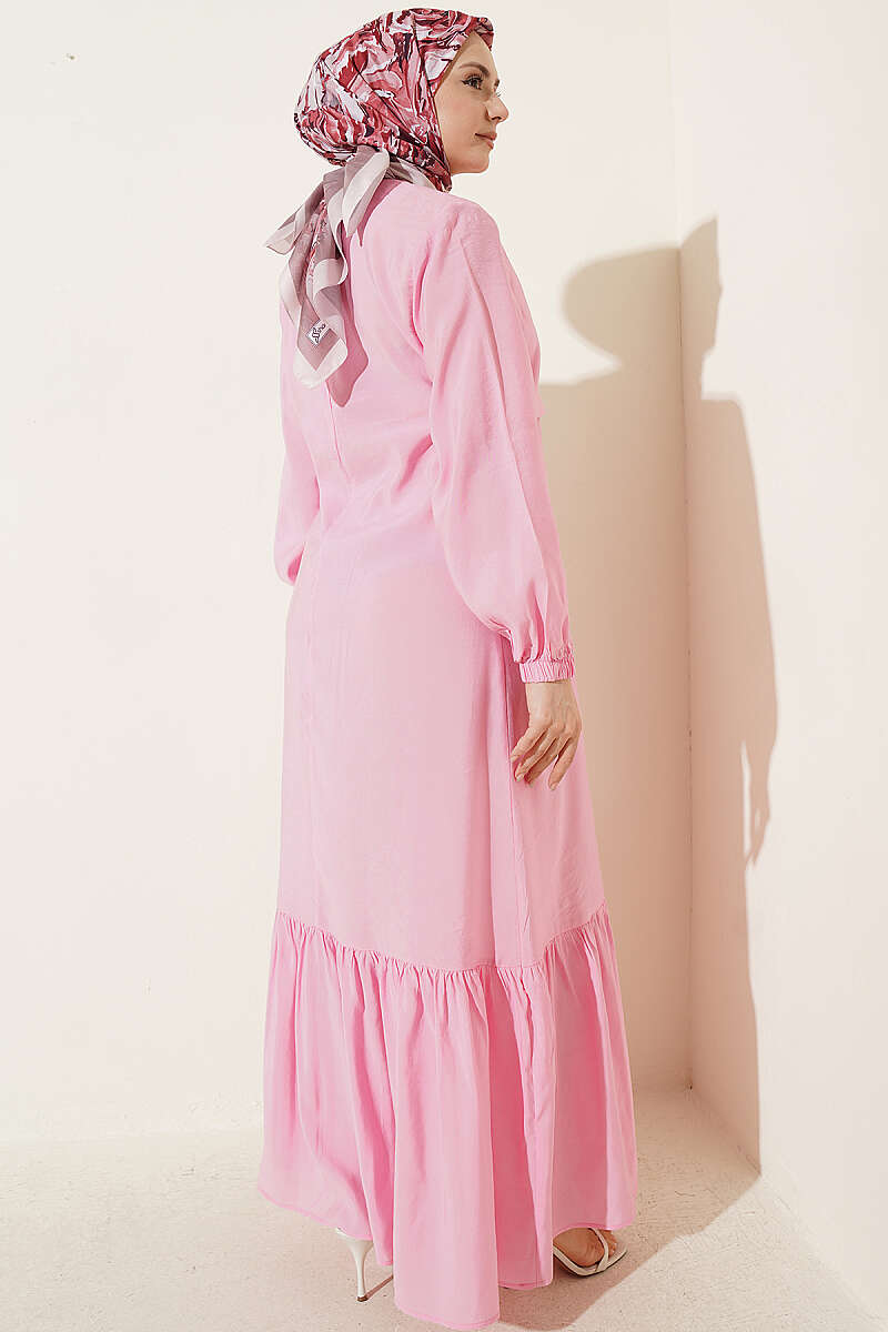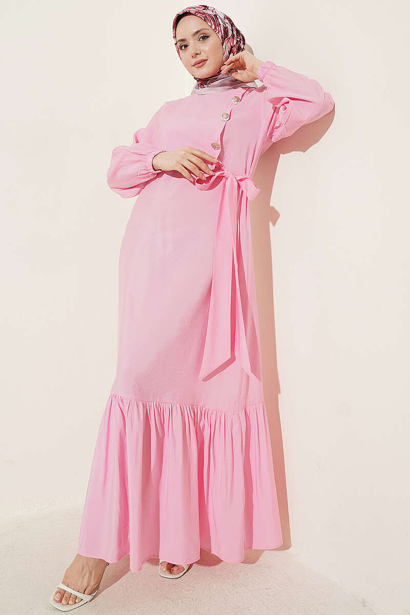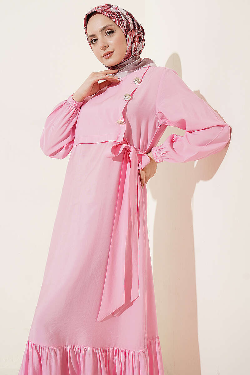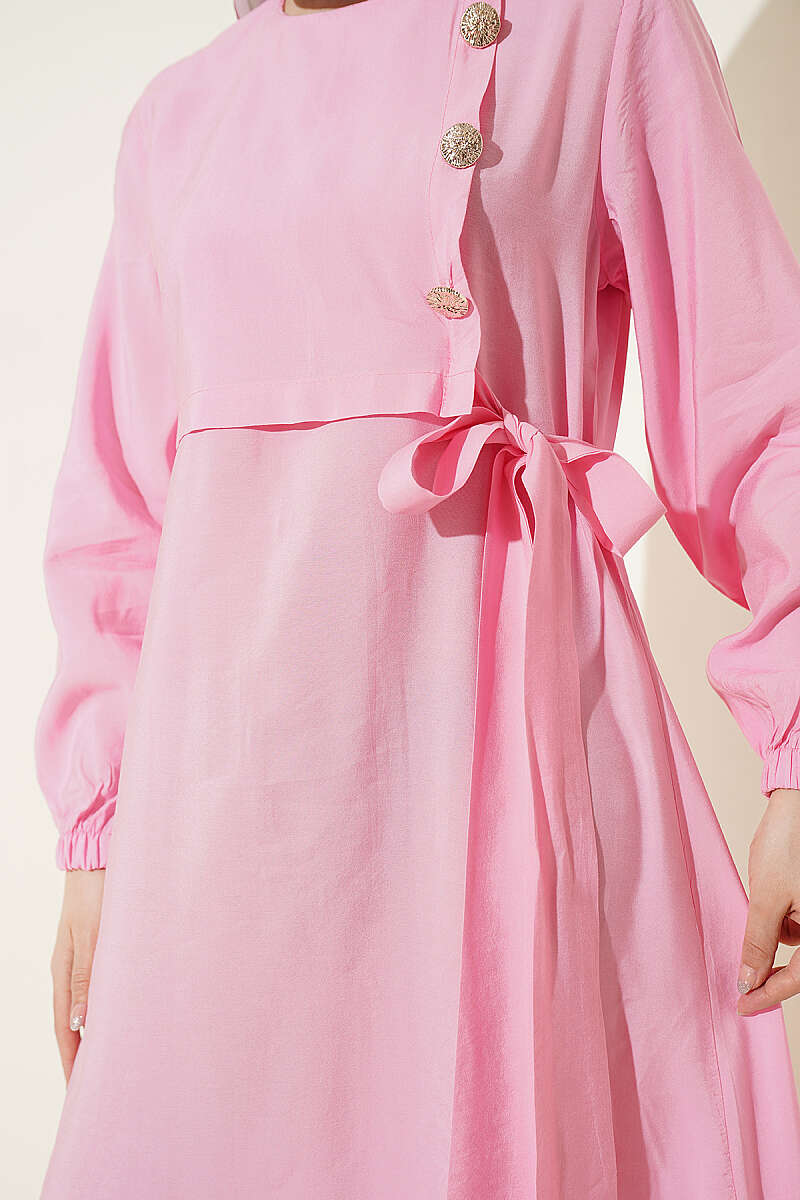 Gold Düğmeli Bağlamalı Modal Elbise Pembe