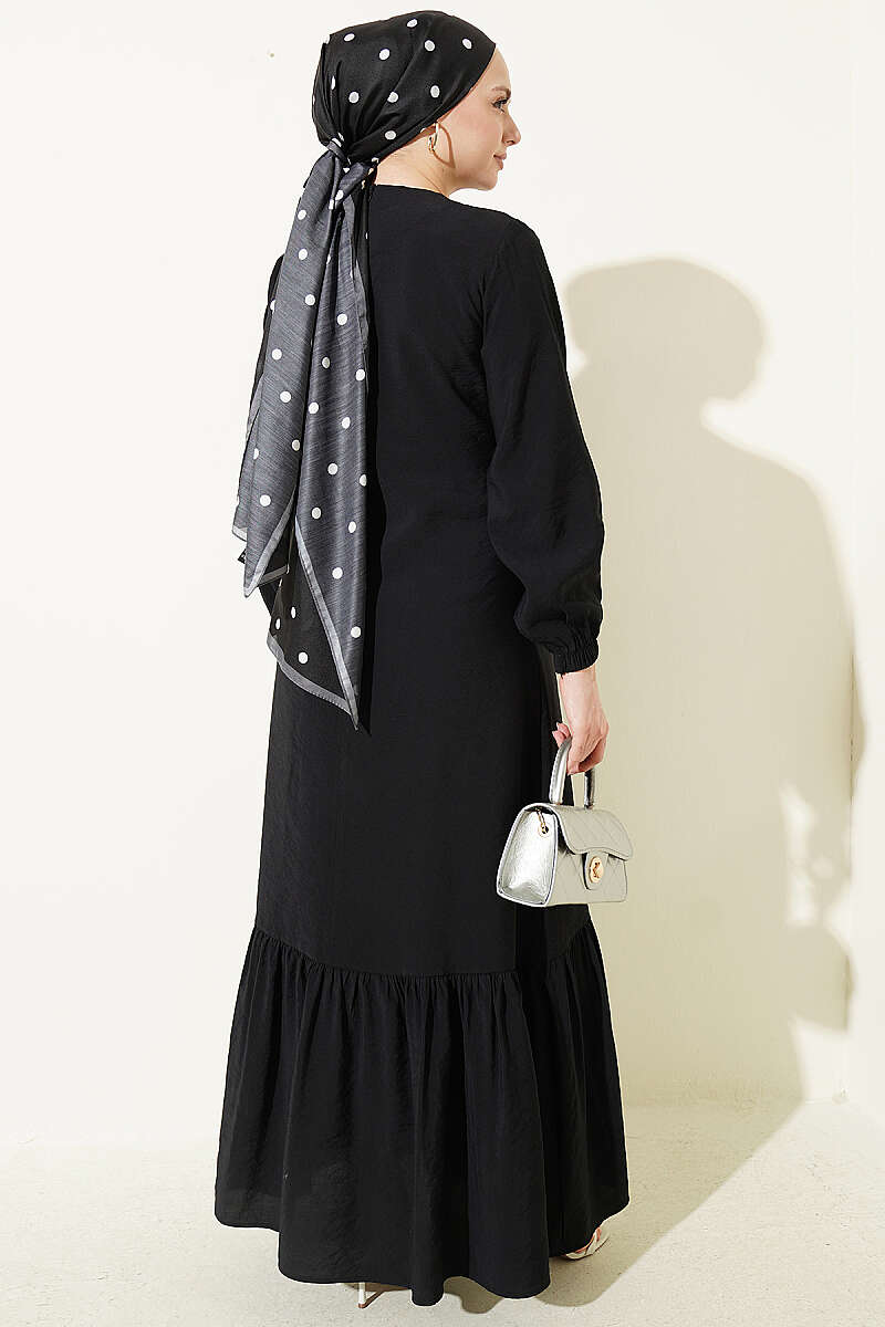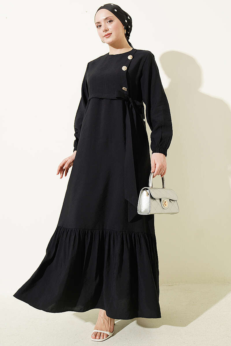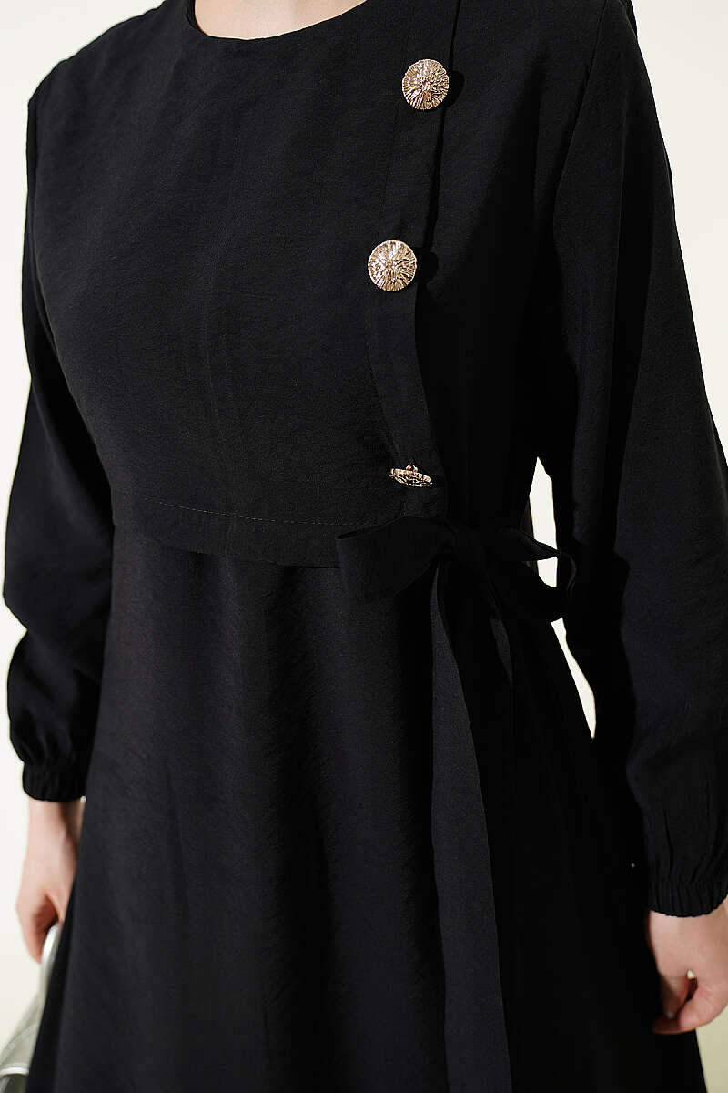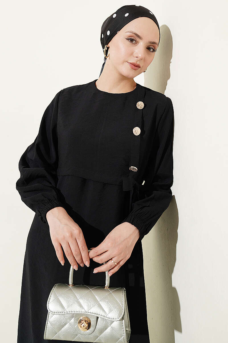 Modal kumaşın yumuşak ve dökümlü dokusuyla tasarlanan bu elbise, gün boyu konforlu ve nefes alan bir kullanım deneyimi sunuyor. Ön kısmında yer alan gold düğme detayları tasarıma lüks bir dokunuş katarken, beldeki ayarlanabilir bağlama detayı silüetinizi zarif bir şekilde vurguluyor. Modern hakim yakası ve dökümlü etek kesimiyle hem günlük şıklıkta hem de ofis ortamında stilinizi ön plana çıkaracak kurtarıcı bir parçadır. Zarif detayları ve kaliteli dokusuyla çabasız zarafeti gardırobunuza taşıyor.
