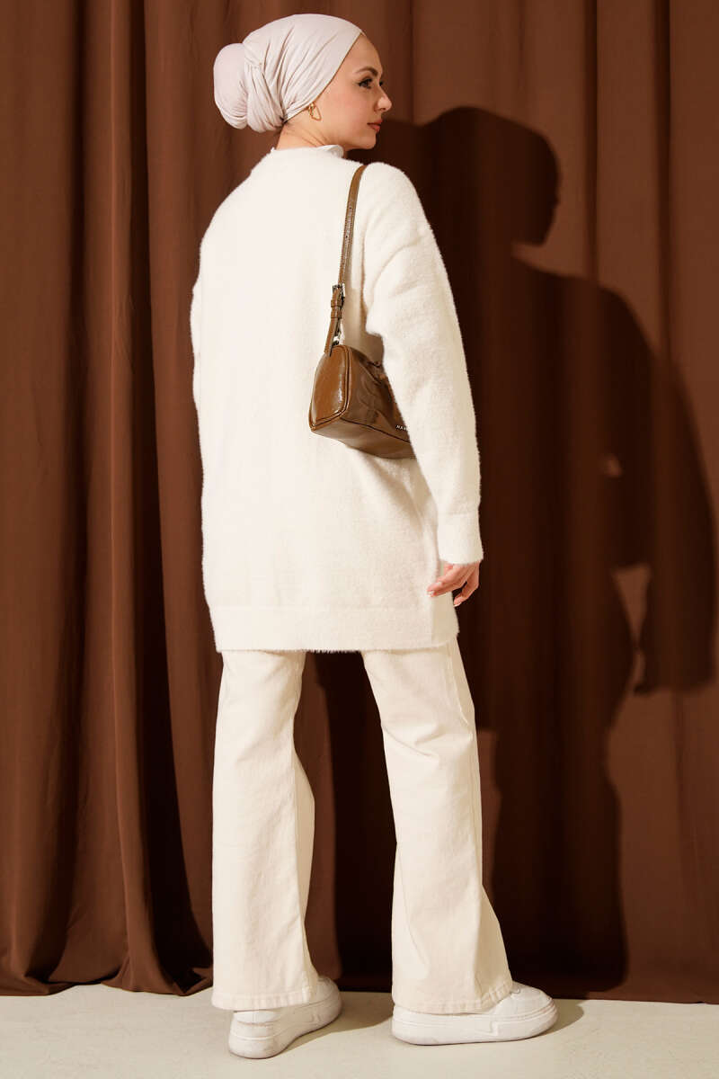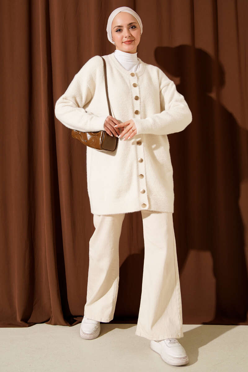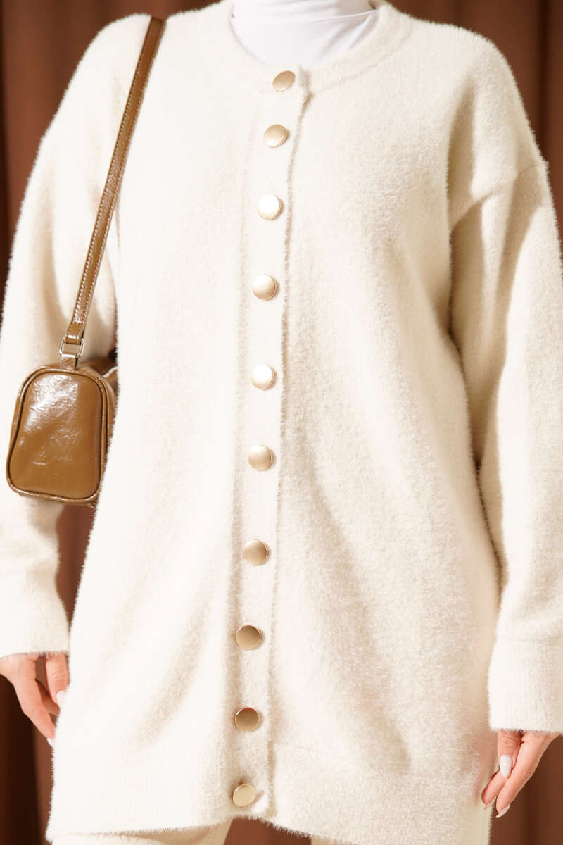 Zikzak Desenli Gold Düğmeli Triko Hırka Ekru