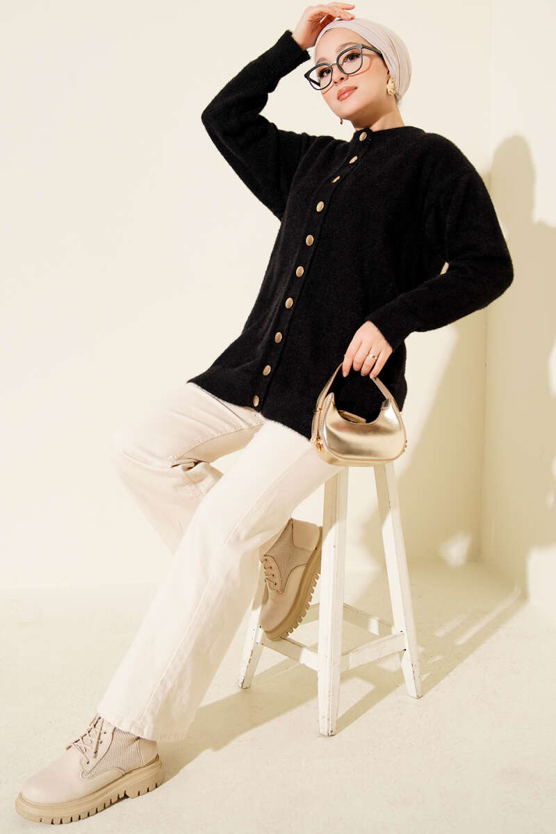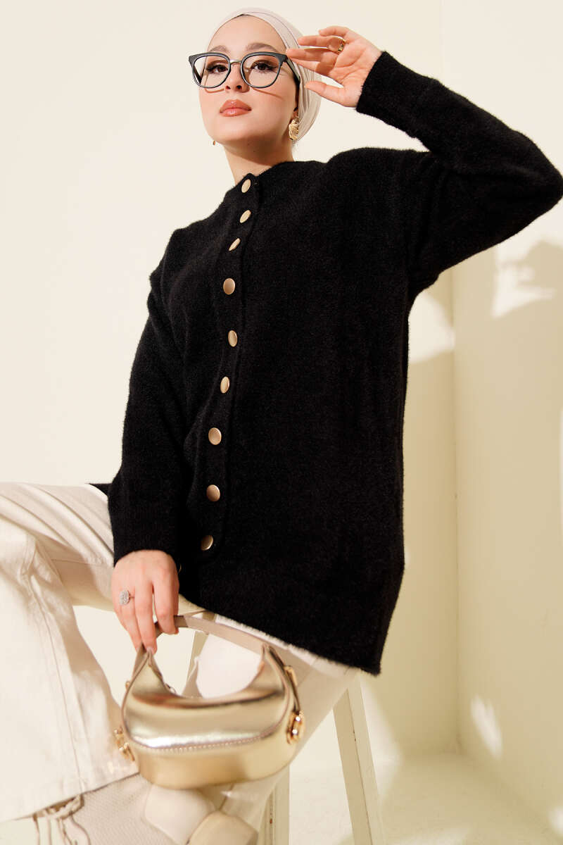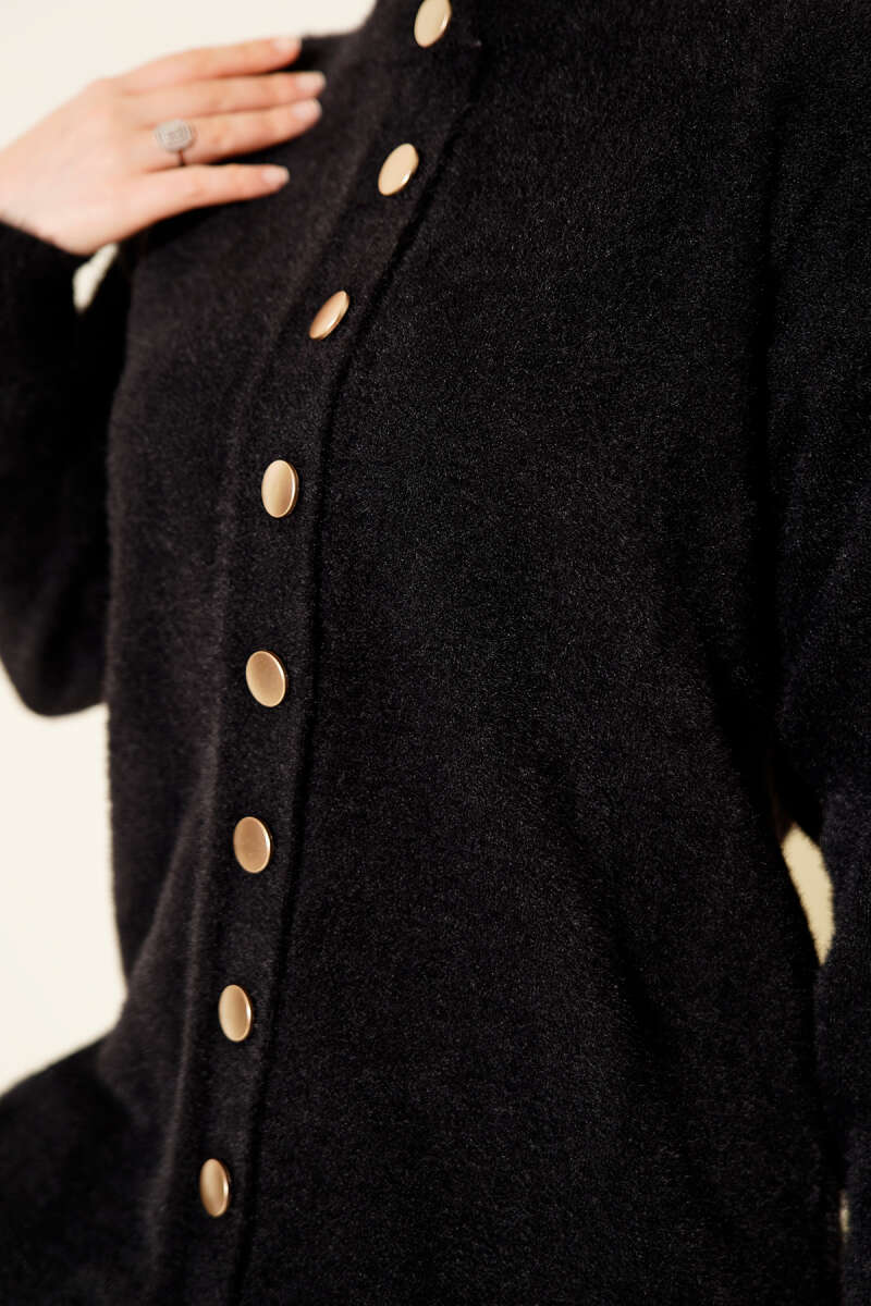 Bel Lastikli Düğmeli Sakallı Triko Hırka Siyah