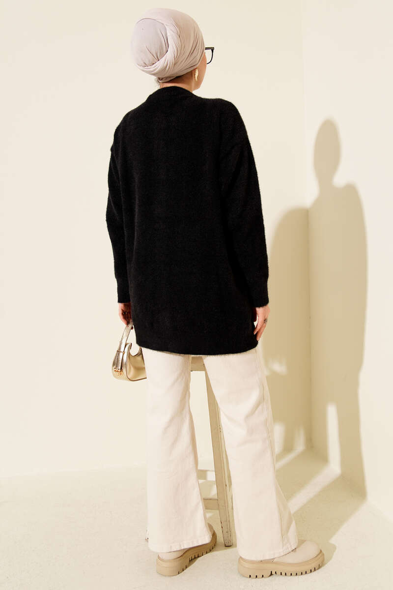Kabartmalı Cepli Uzun Triko Hırka Siyah