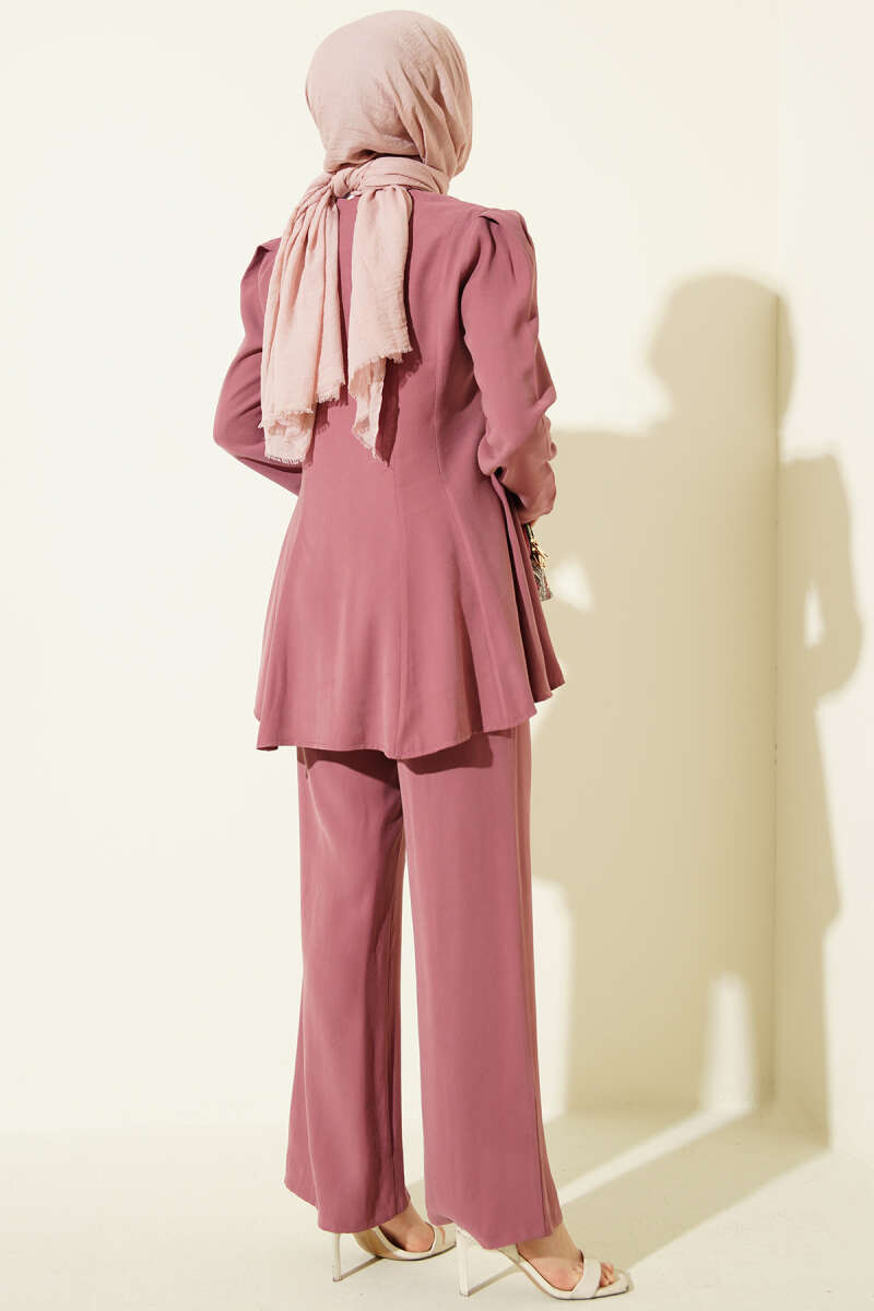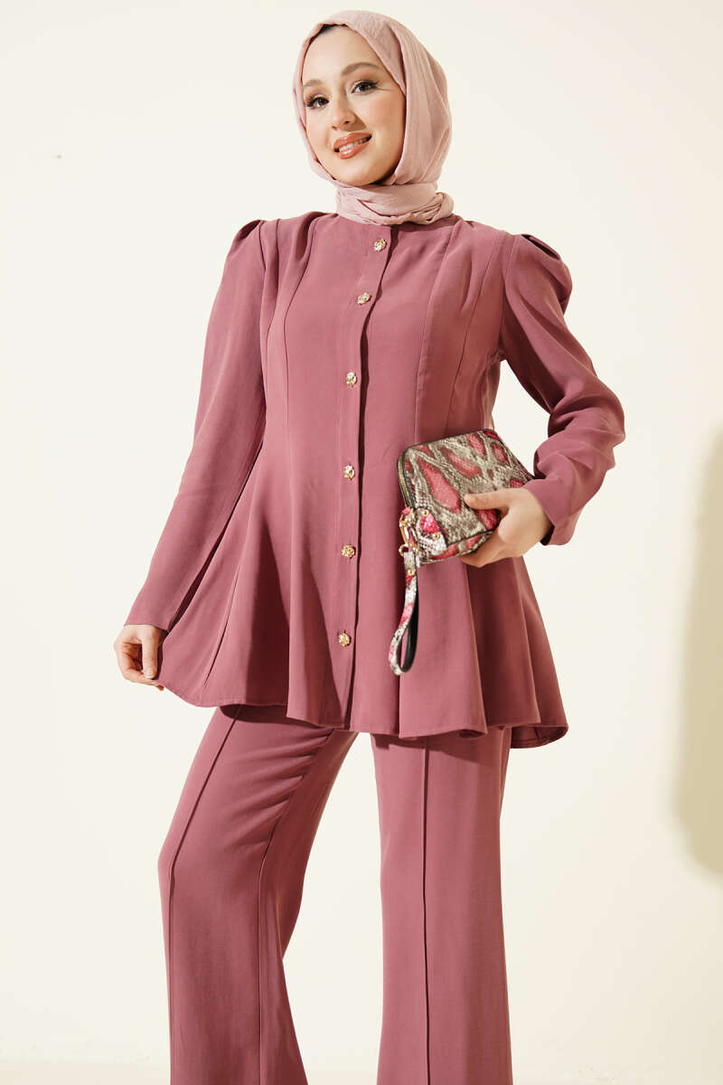 Gold Düğmeli Basic Tensel İkili Takım Gül Kurusu