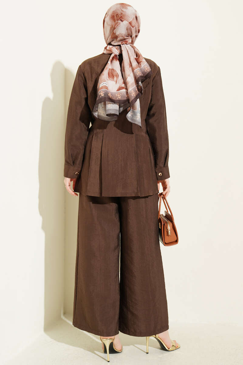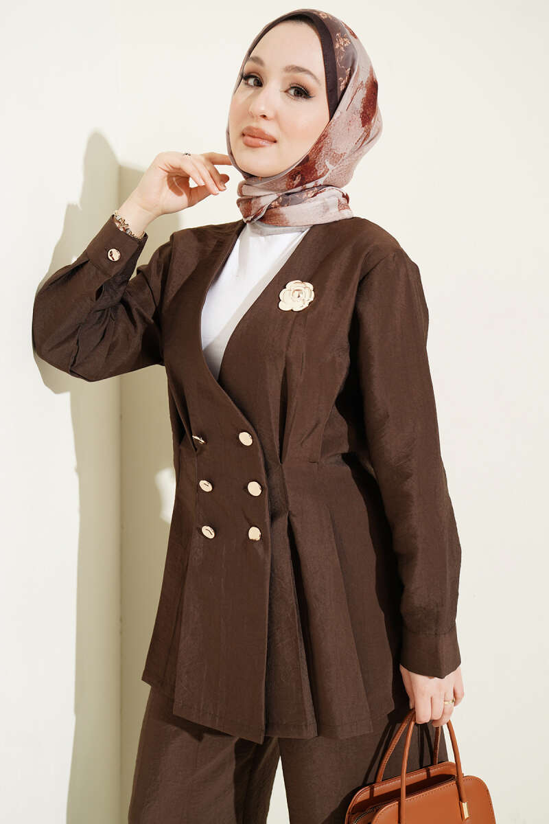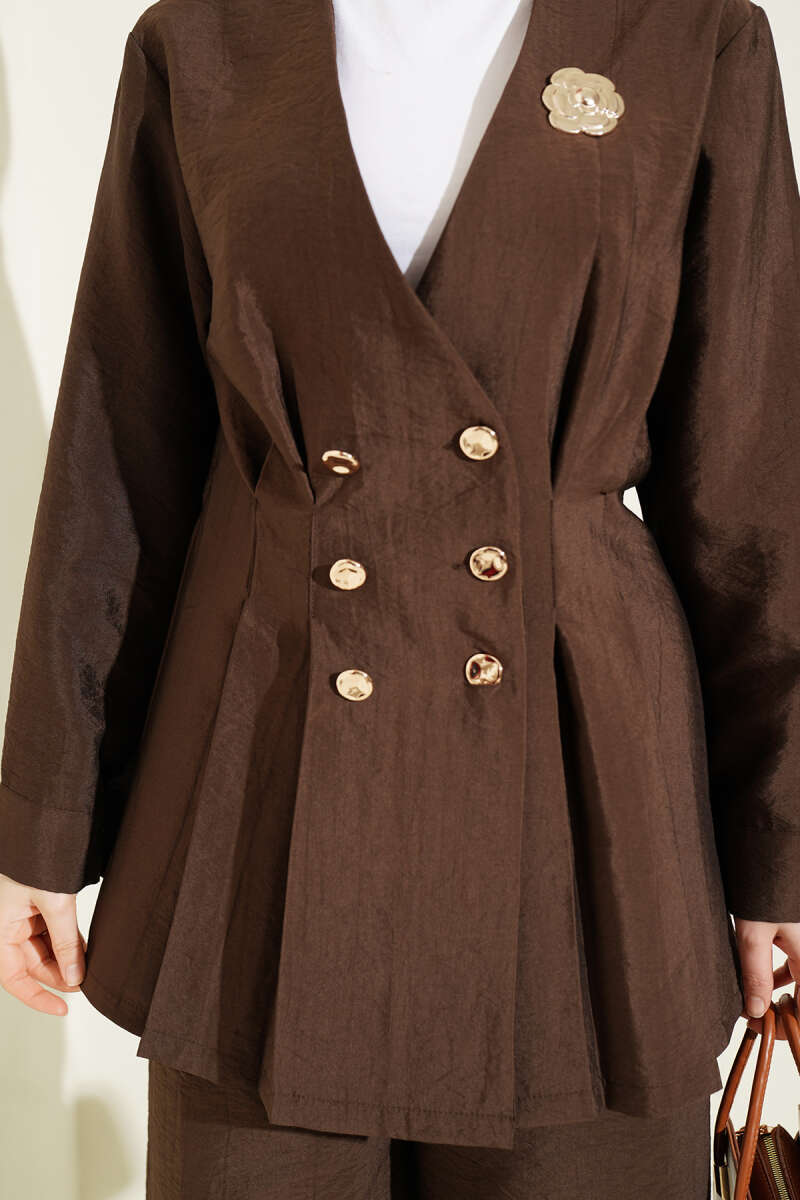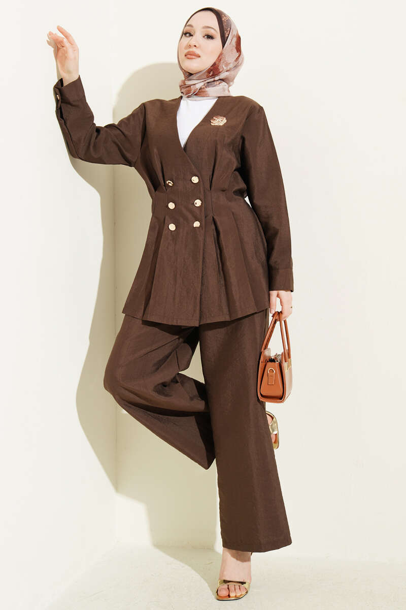 Üzerindeki gold düğme detaylarıyla asil bir duruş sergileyen bu ikili takım, bel kısmındaki pensli yapısı sayesinde vücut hatlarını zarifçe şekillendirerek modern bir silüet sunar. Ceket formundaki üst parça ile uyumlu geniş paça pantolonu, hem profesyonel iş hayatında hem de özel davetlerde zahmetsiz bir şıklık vadeder. Dokulu ve kaliteli kumaş yapısı, konforu elden bırakmadan gün boyu özenli ve sofistike görünmenizi sağlar. Klasik çizgilerin modern detaylarla birleştiği bu tasarım, gardırobunuzun en güçlü ve zamansız kombinlerinden biri olmaya adaydır.