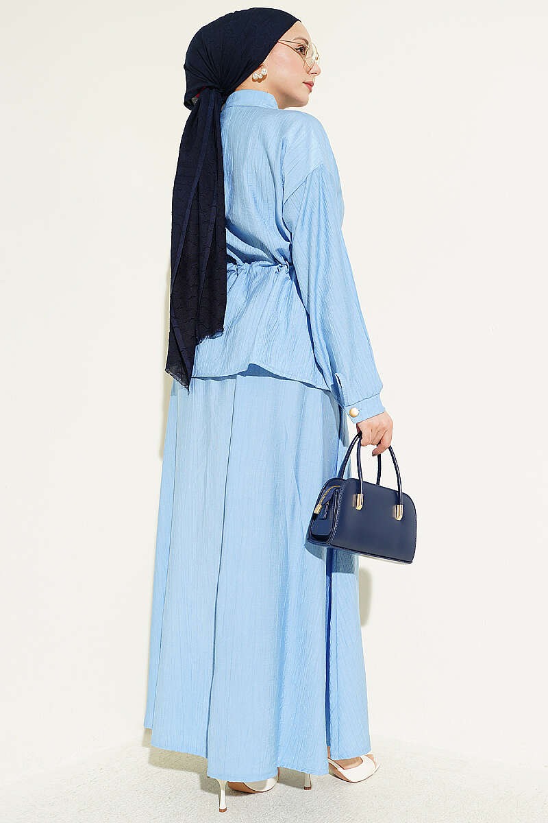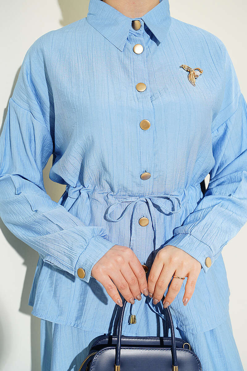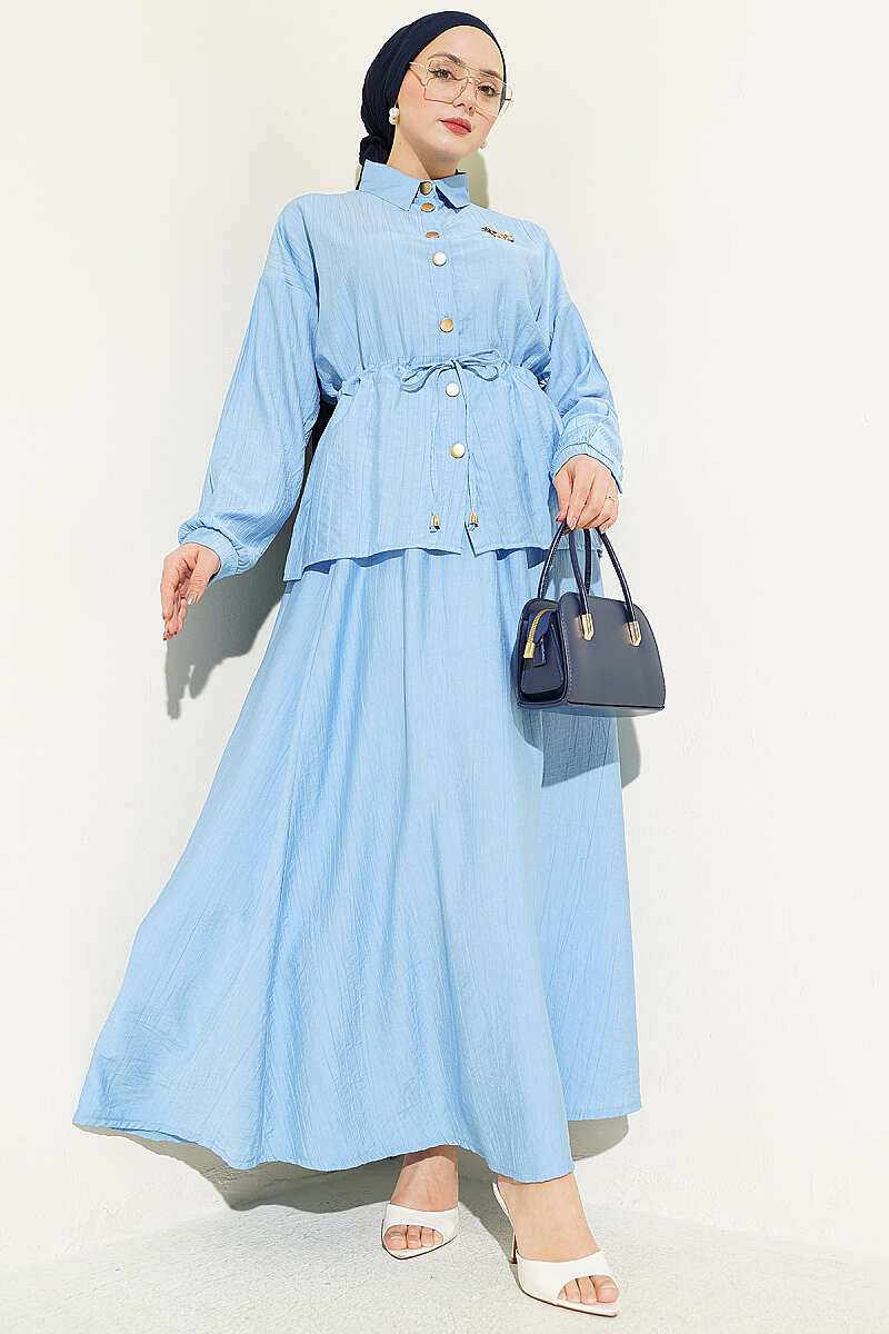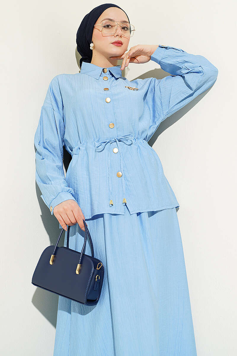 Gold Düğmeli Bel Tünelli Etekli Takım Mavi