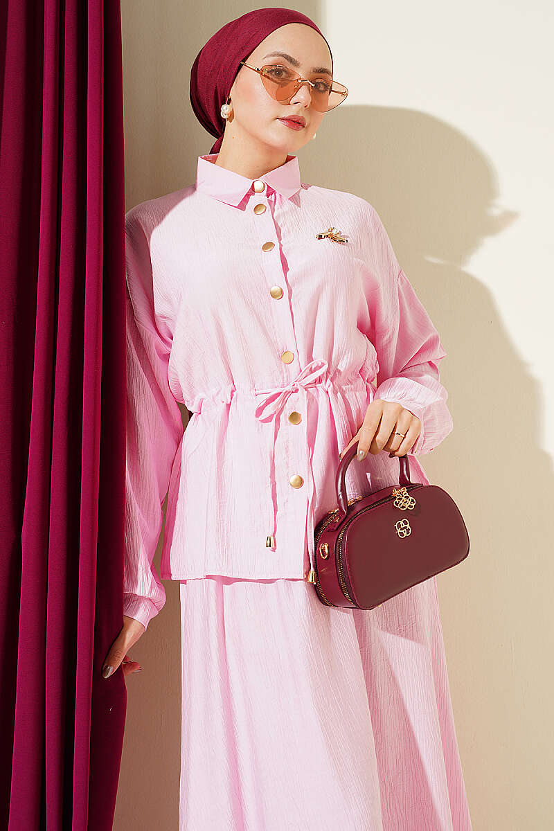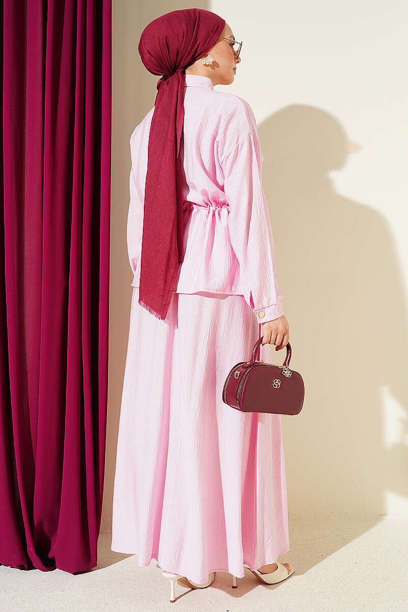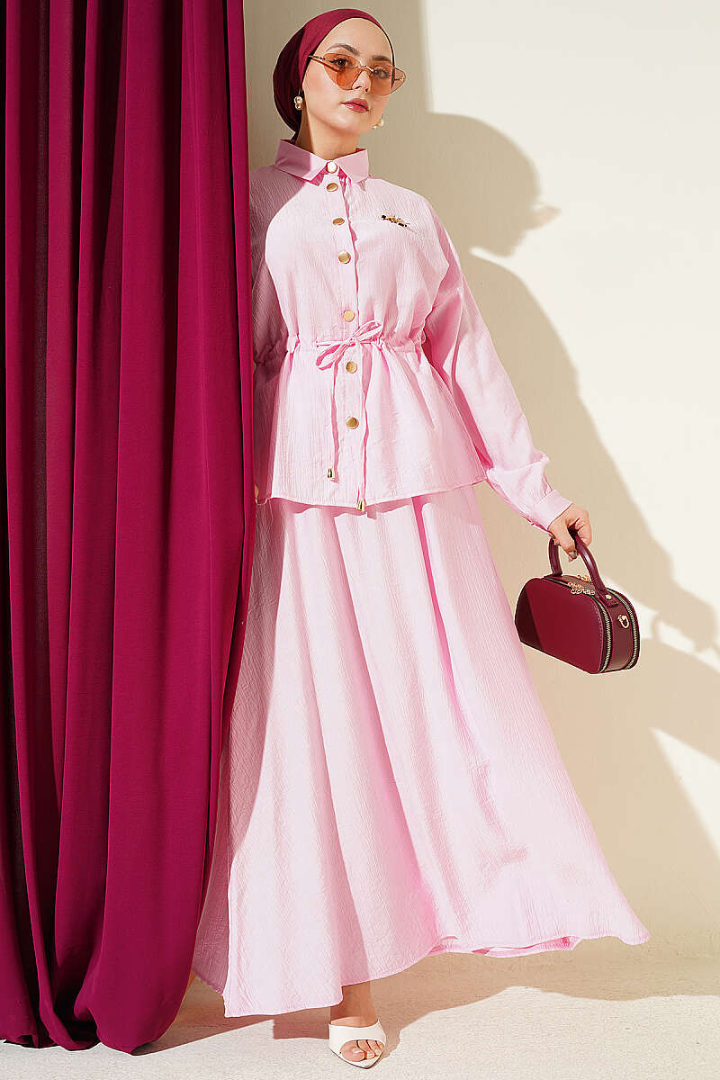 Gold Düğmeli Bel Tünelli Etekli Takım Pembe