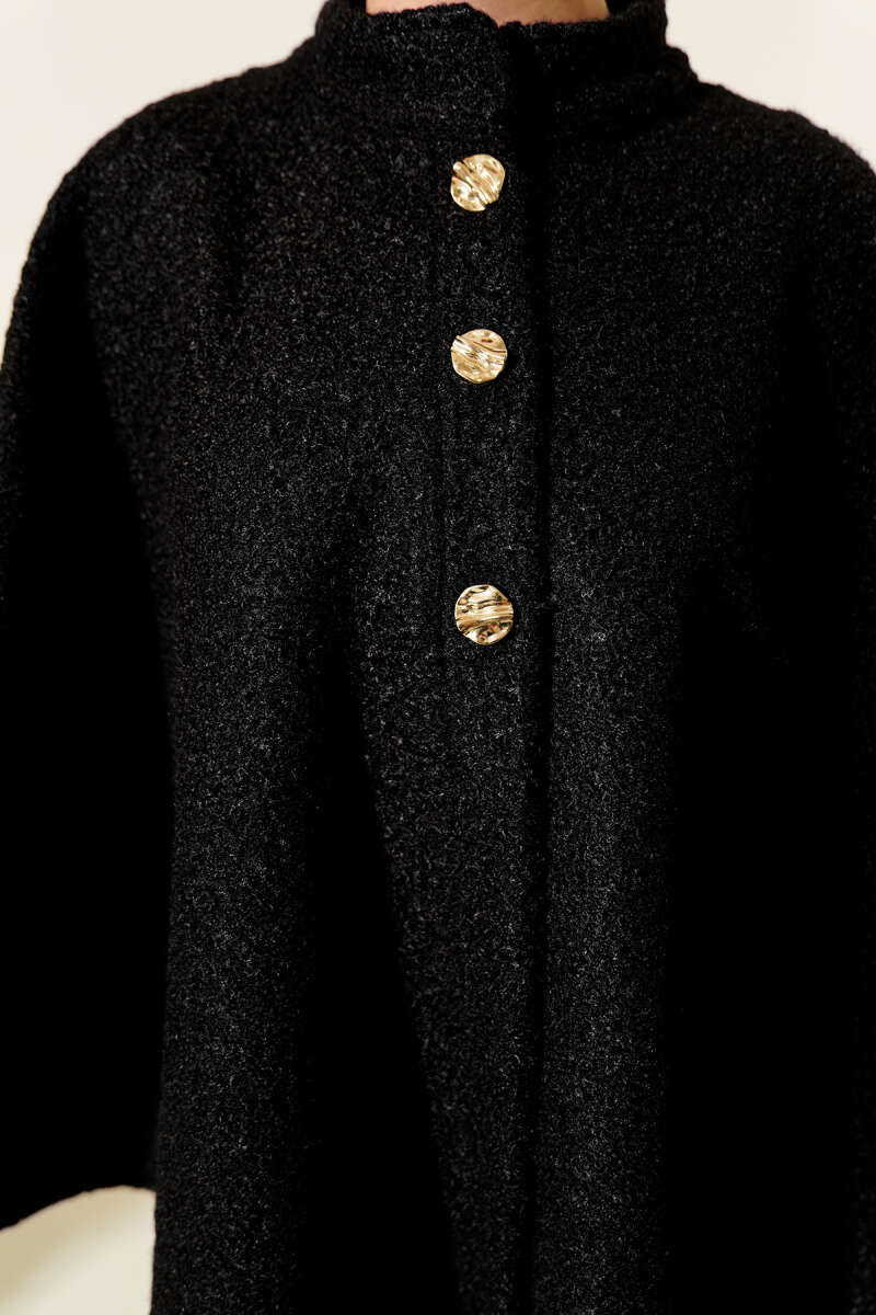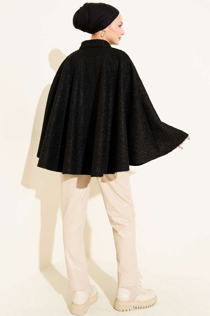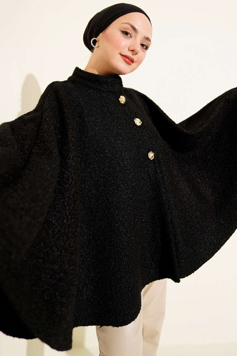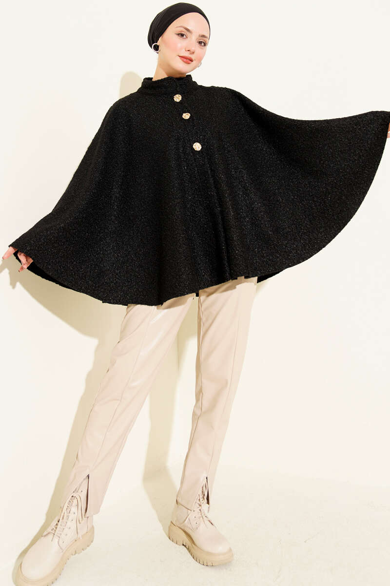 Düğmeli Kapüşonlu Granili Panço Siyah