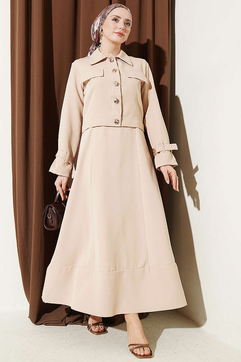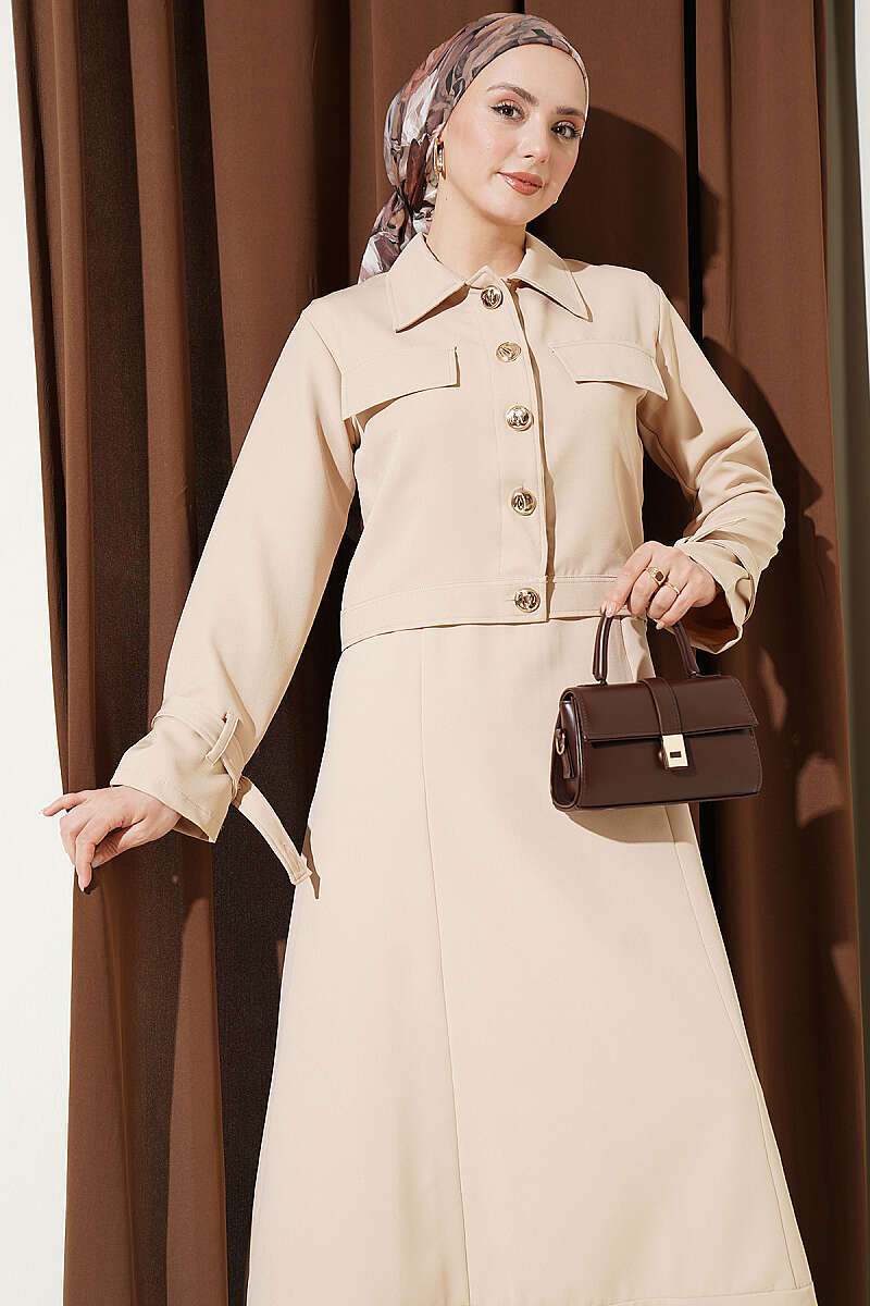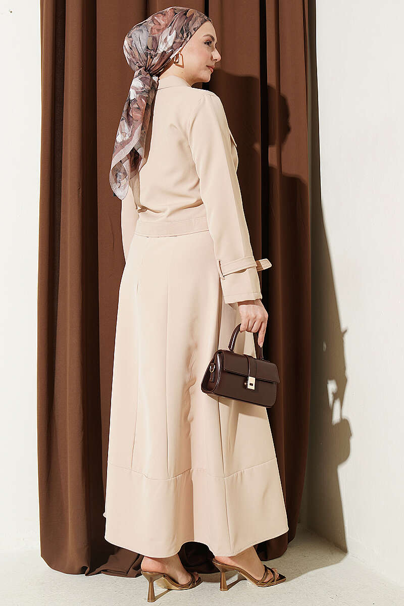 Bel Lastikli Büzgülü Etekli İkili Takım Bej
