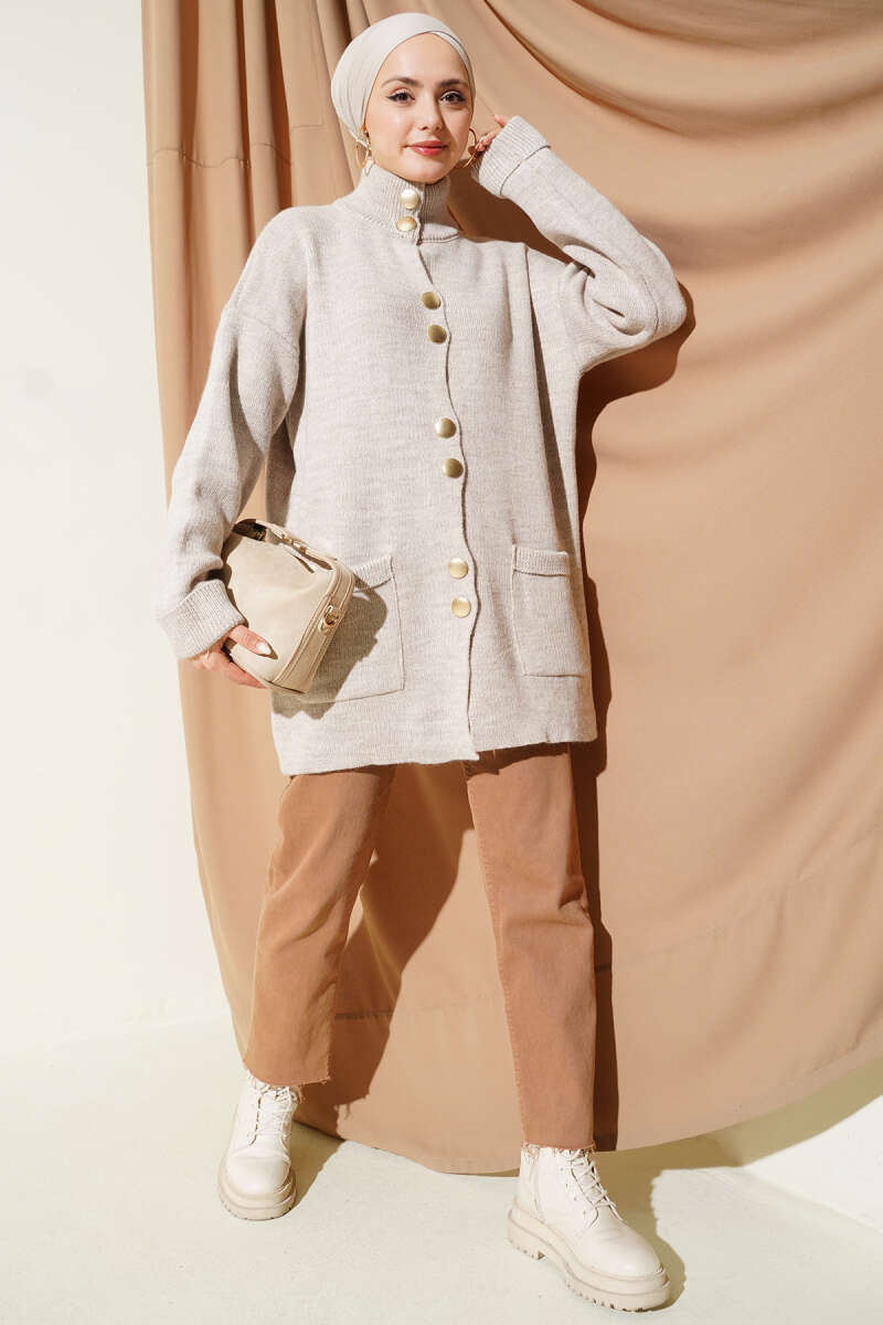 Cepli Gold Düğmeli Triko Hırka Bej