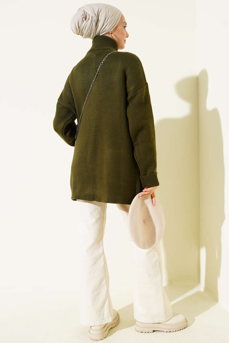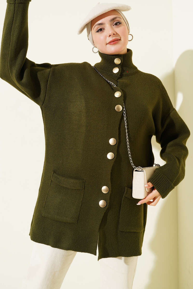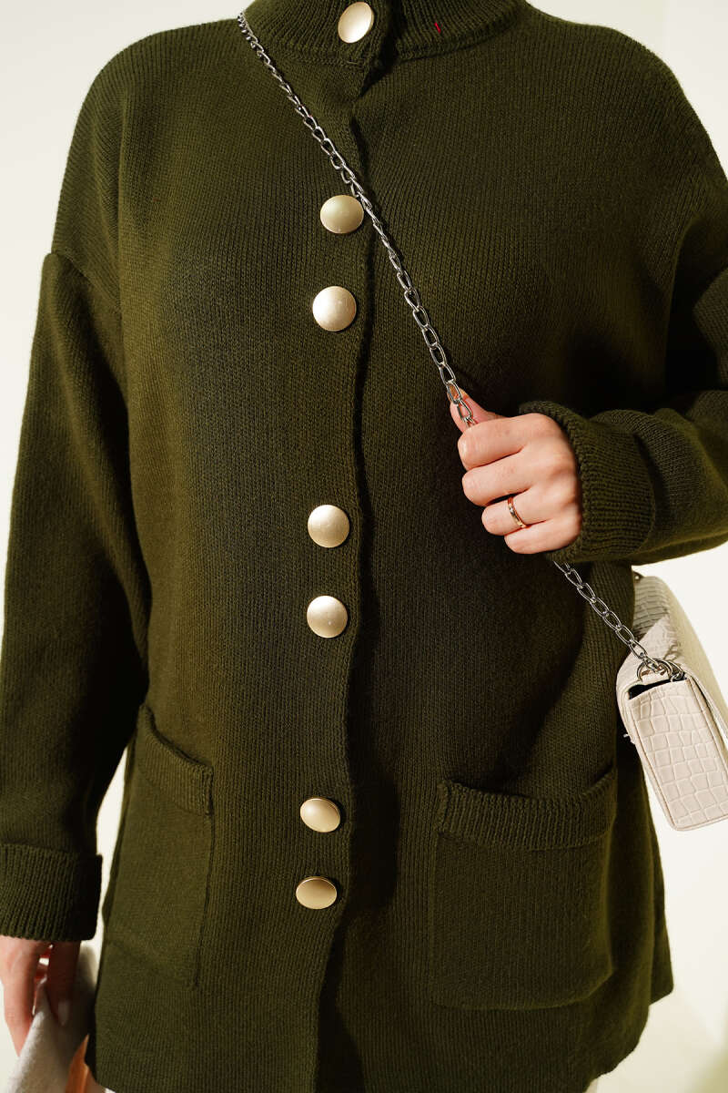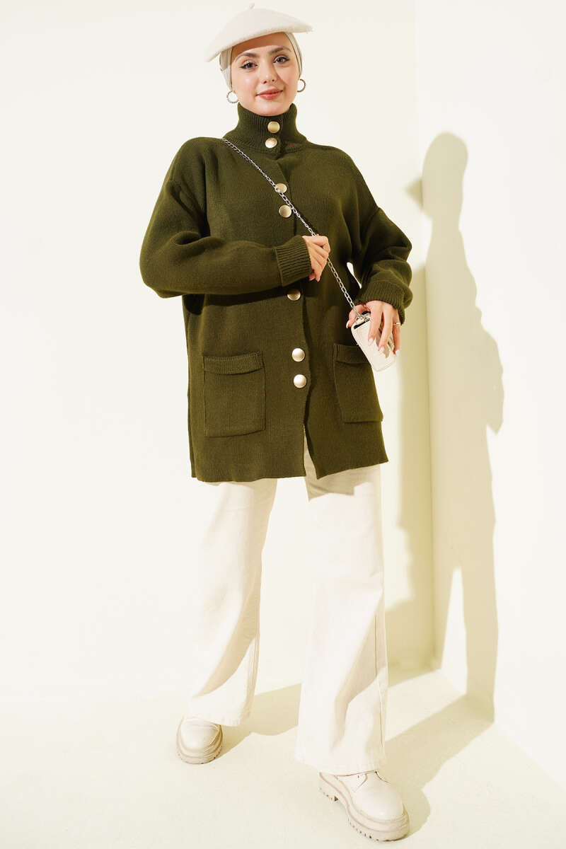 Düğmeli Cepli Uzun Triko Hırka Haki