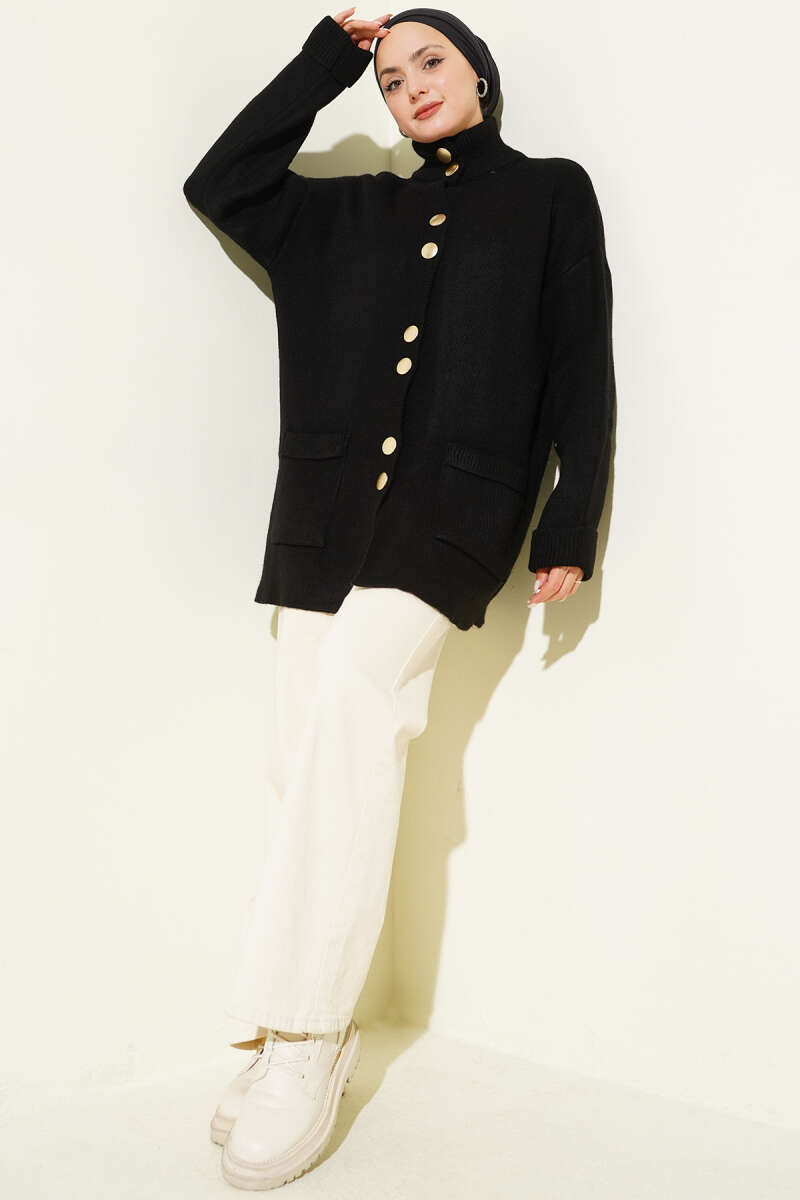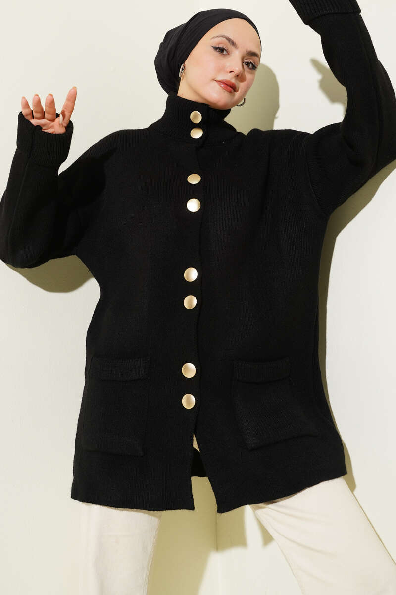 Düğmeli Cepli Uzun Triko Hırka Petrol