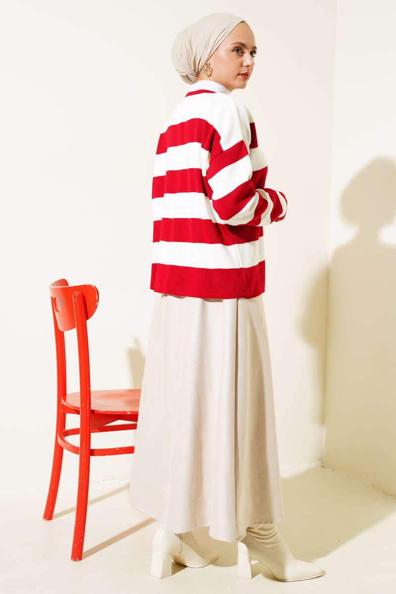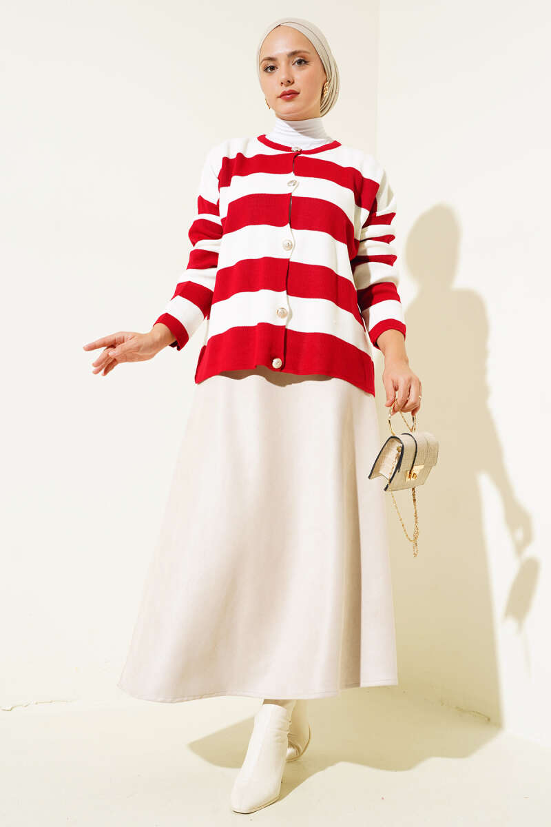 Zikzak Desenli Gold Düğmeli Triko Hırka Kırmızı