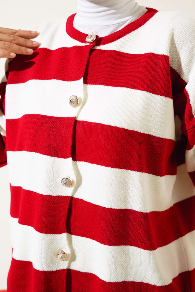 Gold Düğmeli Çizgili Kısa Triko Hırka Kırmızı