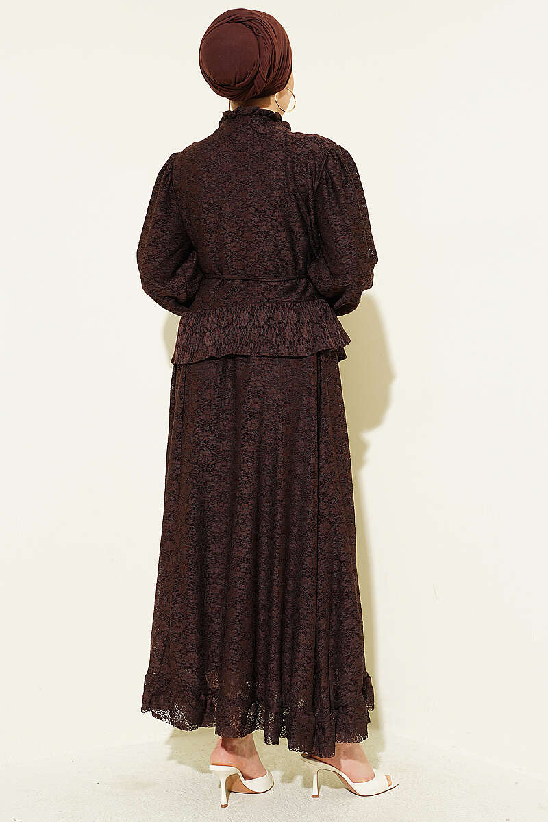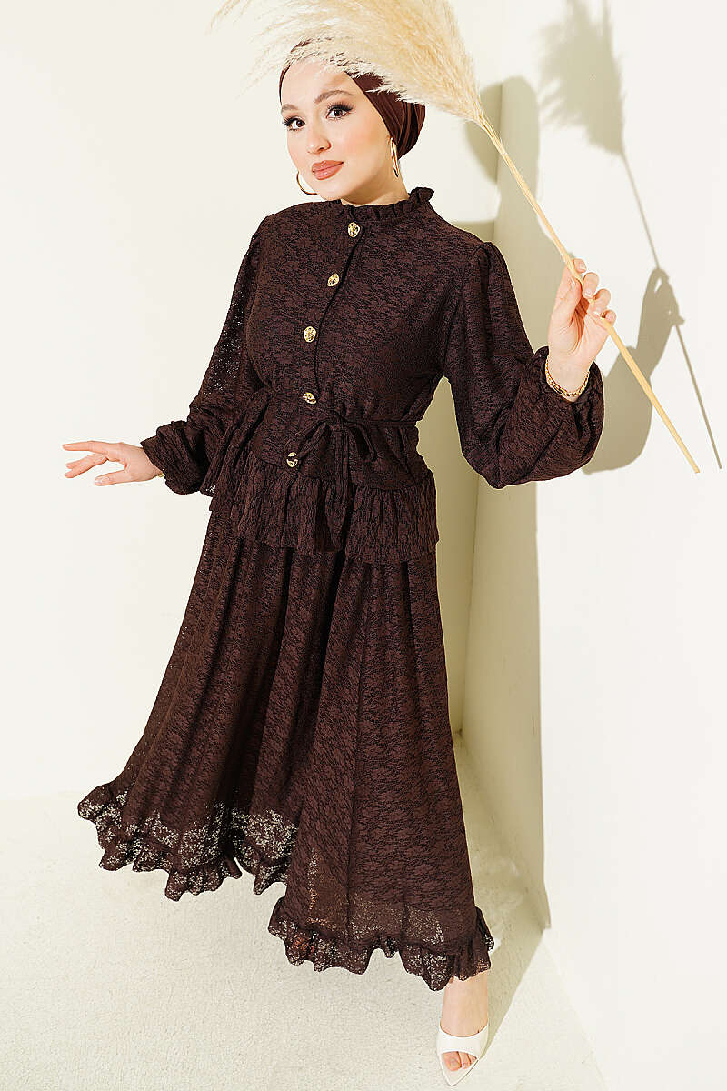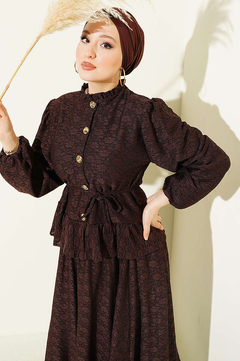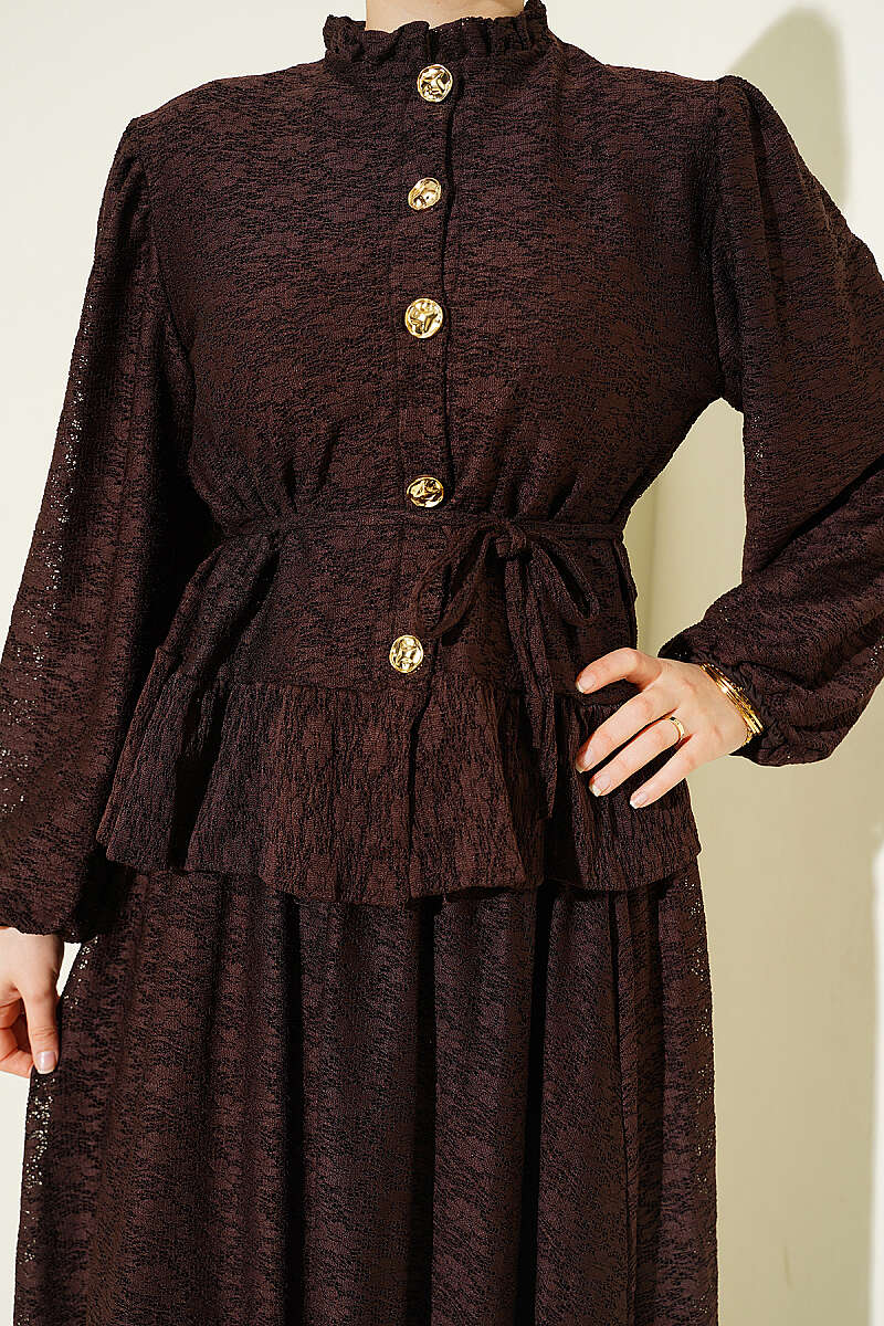 Gold Düğmeli Dantelli Etekli İkili Takım Kahve