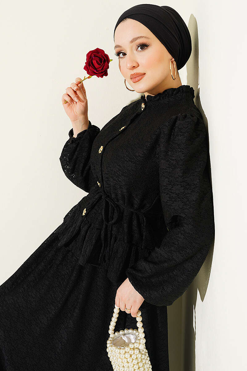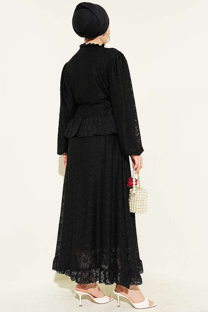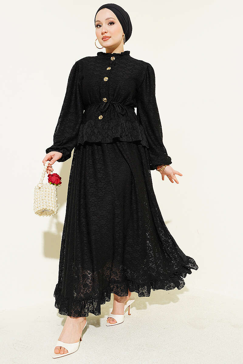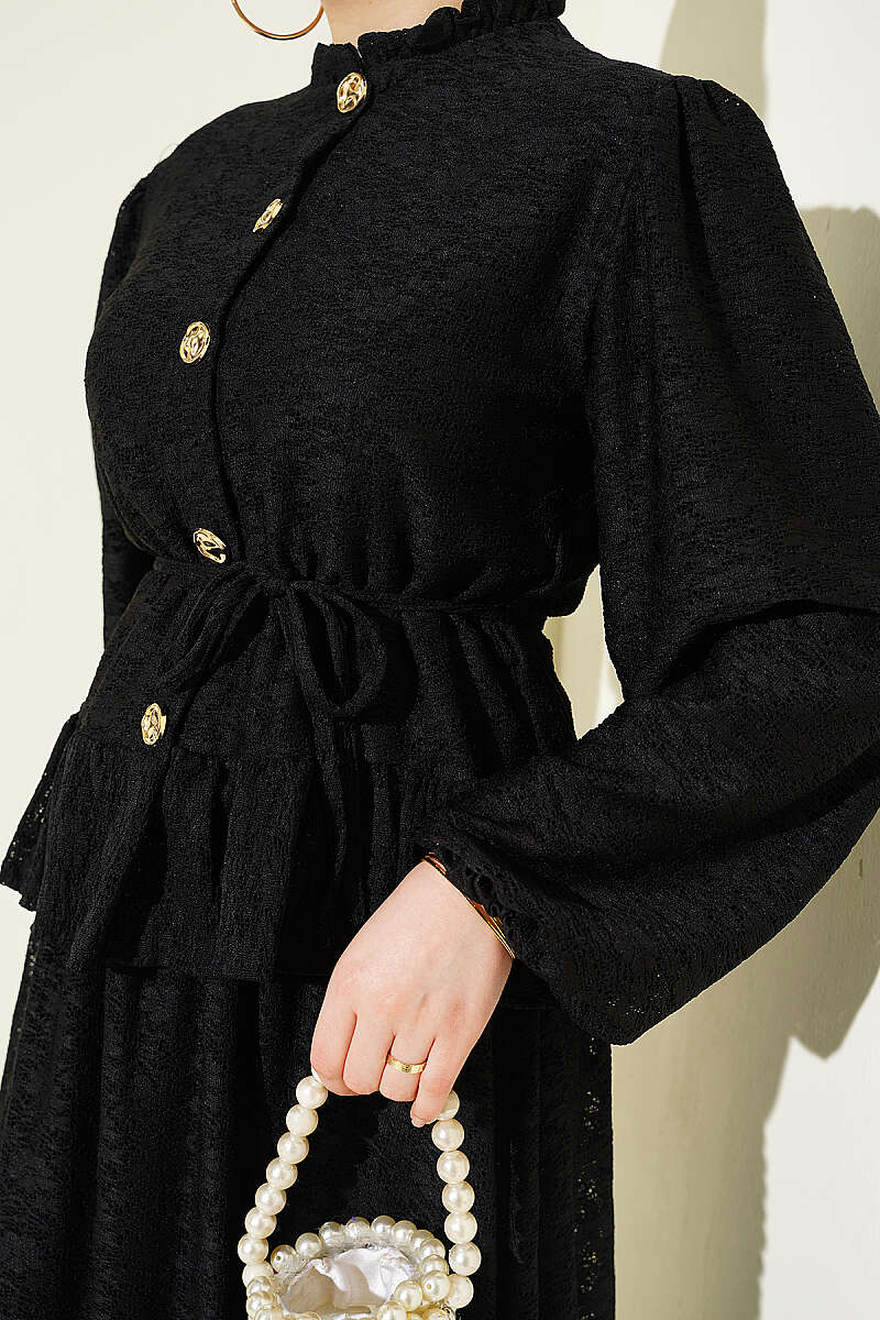 Gold Düğmeli Dantelli Etekli İkili Takım Siyah