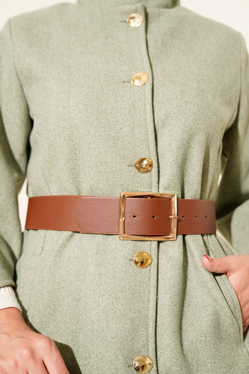 Yarım Düğmeli Balon Kol Kemerli Elbise Kahve