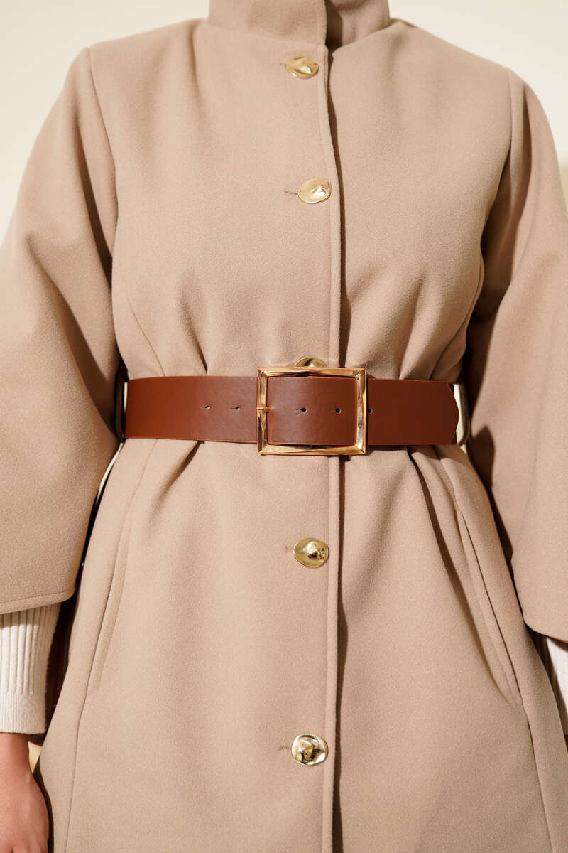 Yarım Düğmeli Balon Kol Kemerli Elbise Kahve