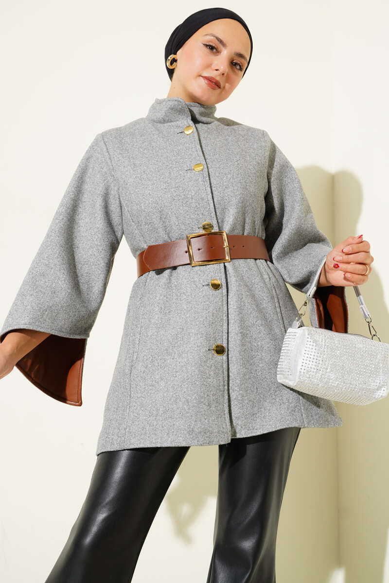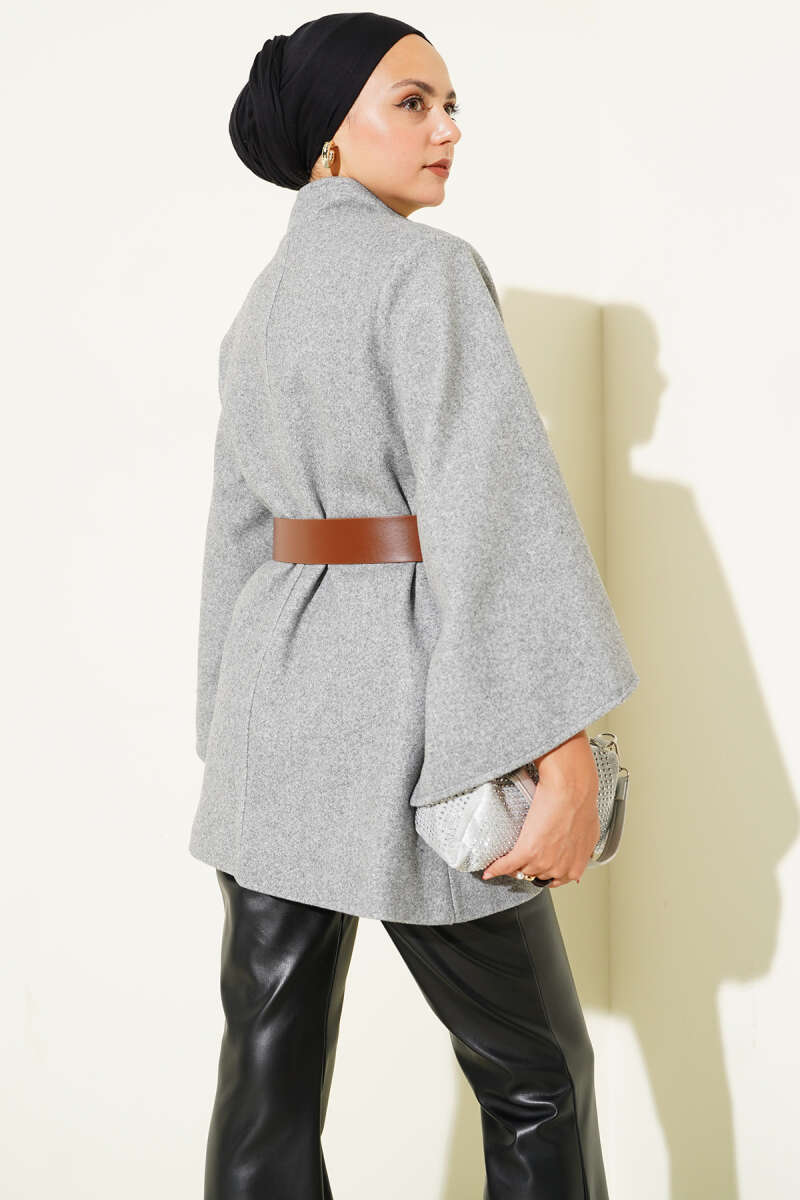 Gömlek Yaka Kürklü Kaşe Panço Gri
