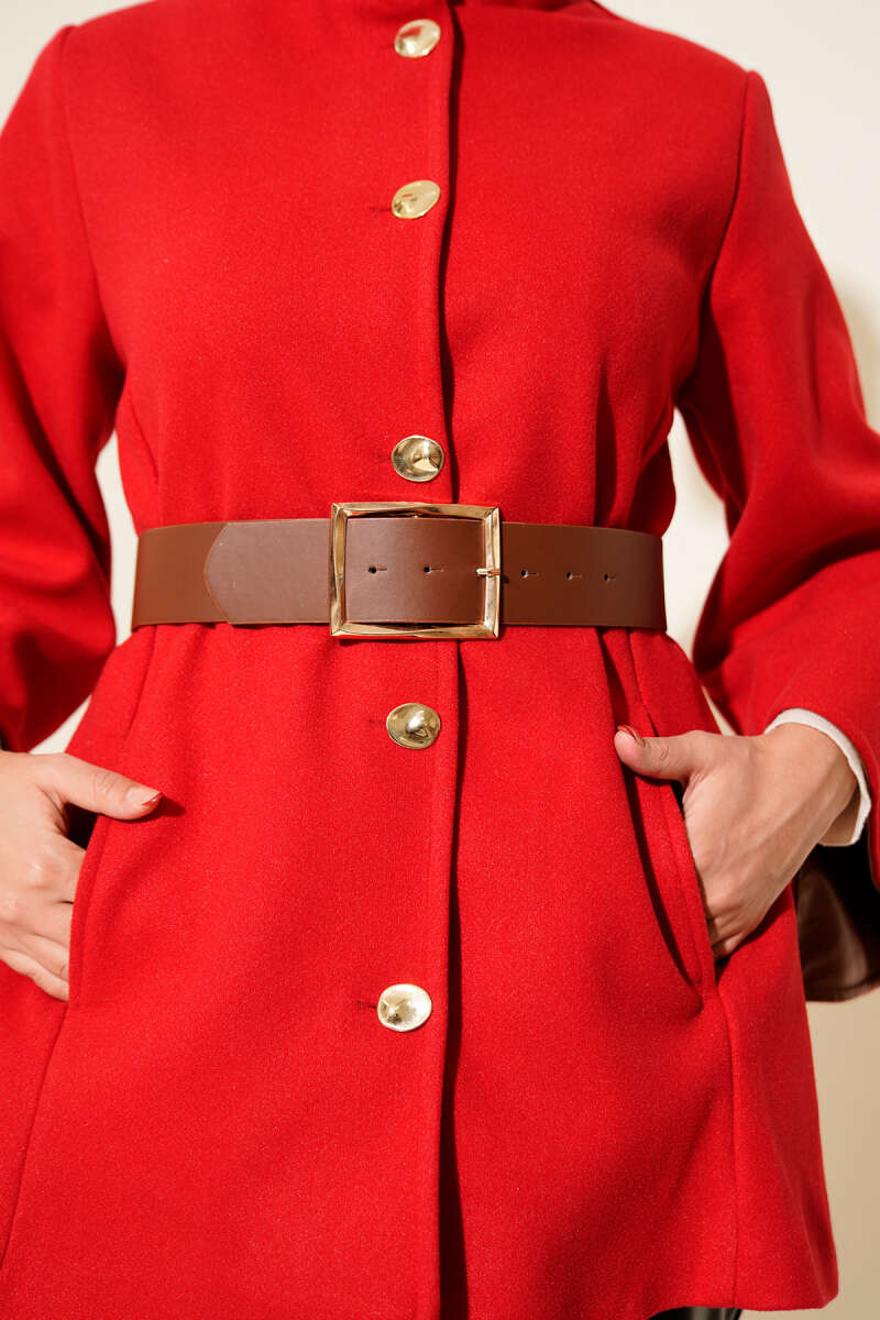 Yarım Düğmeli Balon Kol Kemerli Elbise Kahve