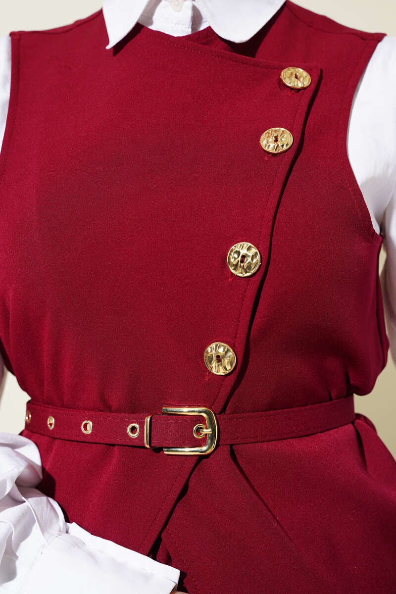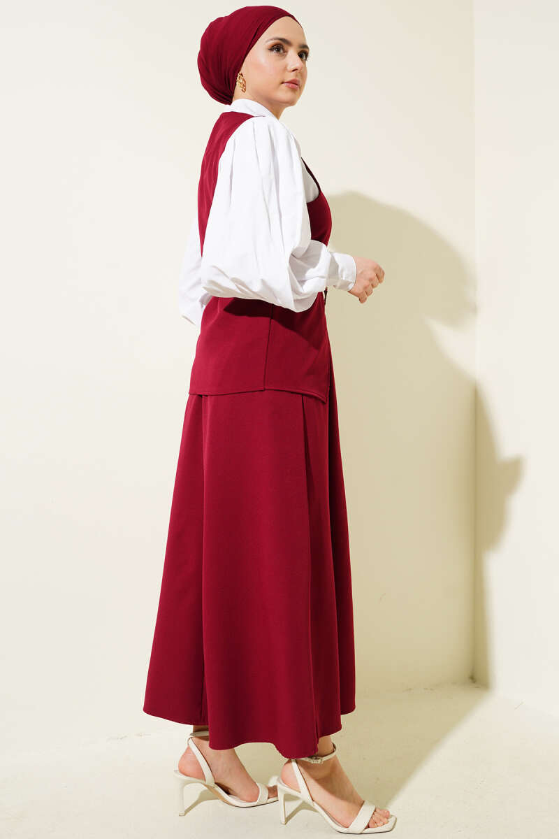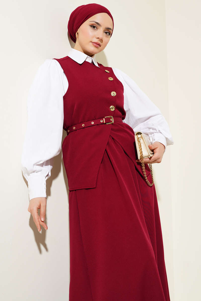 Gold Düğmeli Kemerli Etekli İkili Takım Bordo