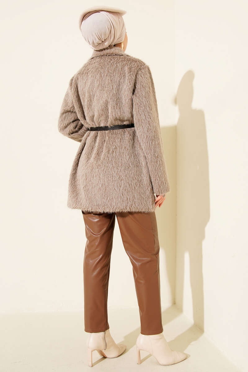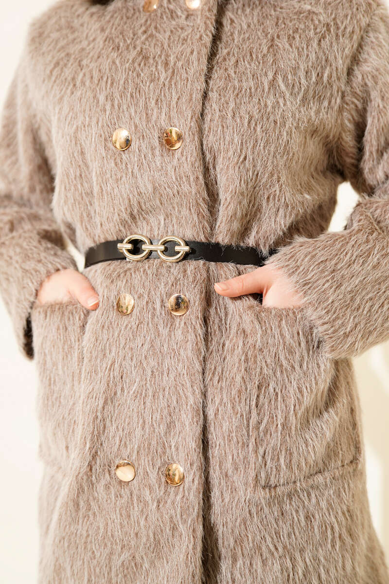 Gold Düğmeli Kemerli Sakallı Ceket Vizon