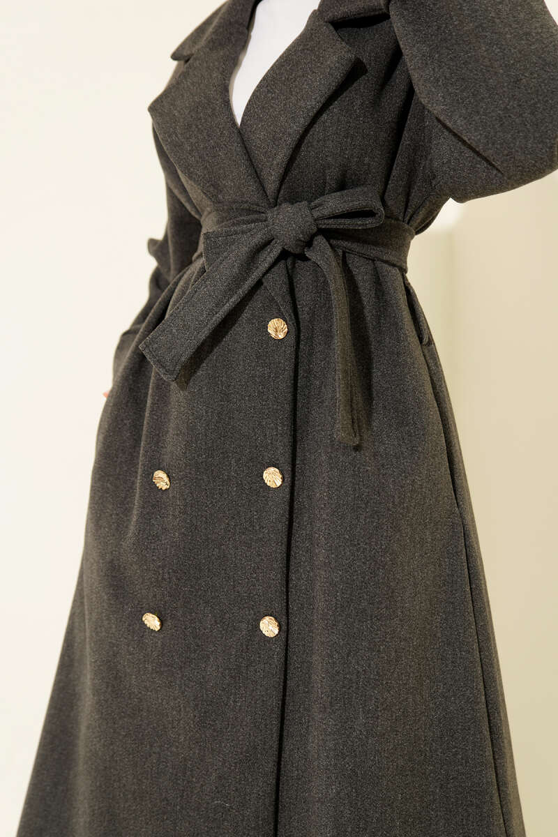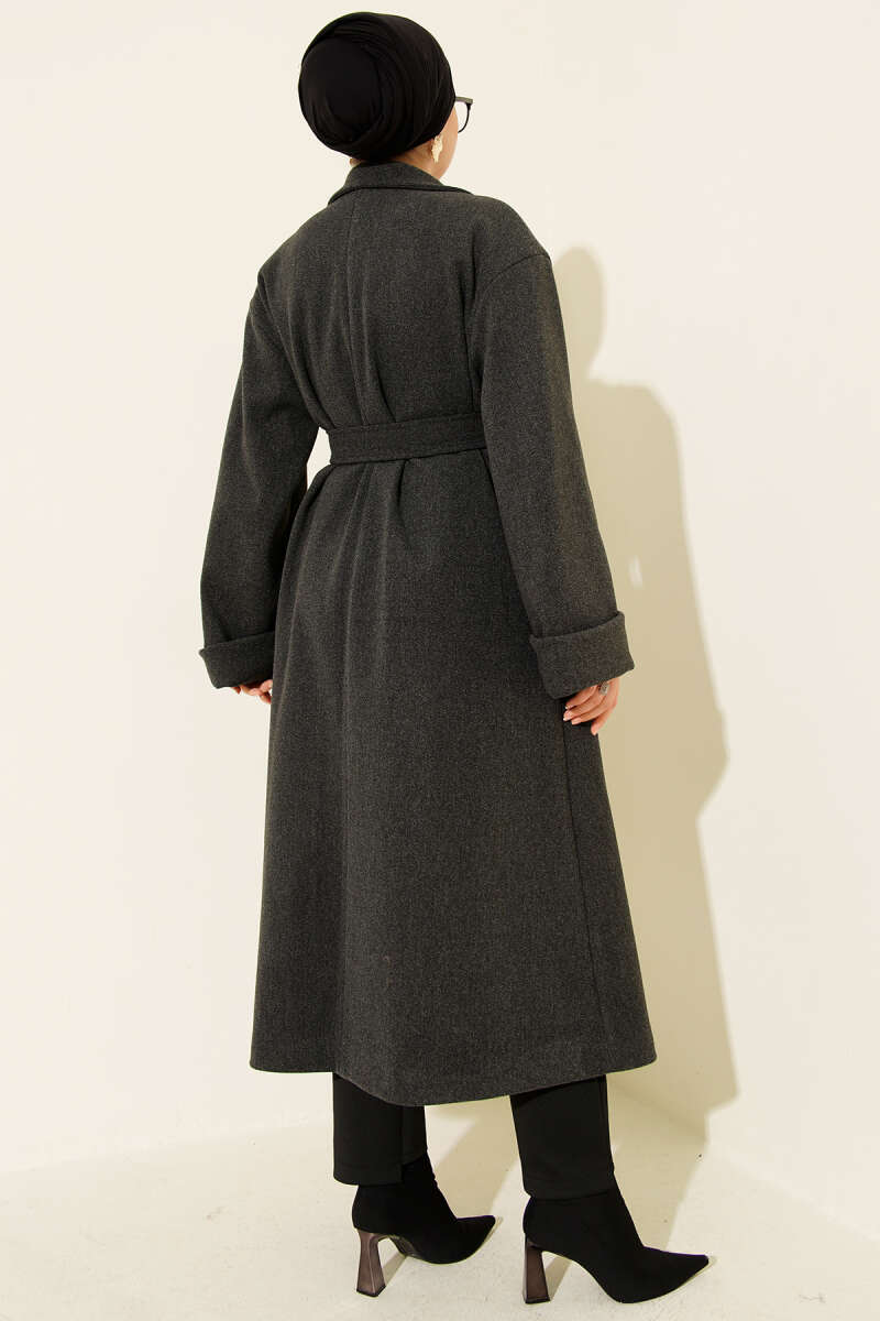Kruvaze Yaka Kuşak Detaylı Kısa Kaşe Kaban Antrasit