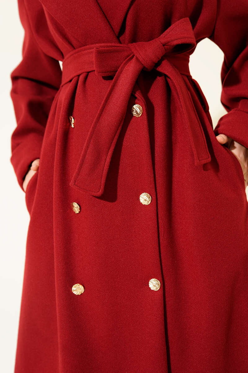 Bilek Düğmeli Kuşaklı Kaşe Kaban Bordo