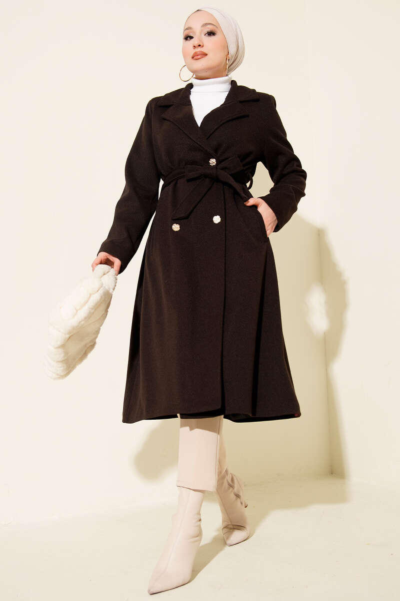 Kuşaklı Gold Düğmeli Kaşe Kaban Taba